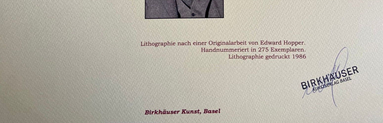 Edward Hopper Lithograph certified COA signature and stamp (Wayne Thiebaud) Edward Hopper "Automatic " Lithograph of an work by Edward Hopper, printed in 1986. 40x31 cm 275 hand numbered specimens signed on the slab The progressive number could be different from the published one. Birkhuser Kunstverlag, Basel Edward Hopper "Automatic" Lithograph of an work by Edward Hopper, printed in 1986. 40x31 cm 275 hand numbered specimens signed on the slab The progressive number could be different from the published one. Birkhuser Kunstverlag, Basel Related keywords lithograph edward hopper wayne thiebaud lithograph signed numbered signed lithograph thiebaud edward hopper framed edward hopper print wayne thiebaud edward hopper signed edward hopper edward hopper signed art edward hopper painting wayne thiebaud signed edward hopper etching wayne thiebaud print edward hopper prints wayne thiebaud signed prints edward hopper lithograph wayne thiebaud lithograph edward hopper art wayne thiebaud print wayne thiebaud signed painting edward hopper signature edward wayne thiebaud hopper wayne thiebaud lithograph wayne thiebaud stamp wayne thiebaud hopper lithograph wayne thiebaud hopper stamp wayne thiebaud Provided by