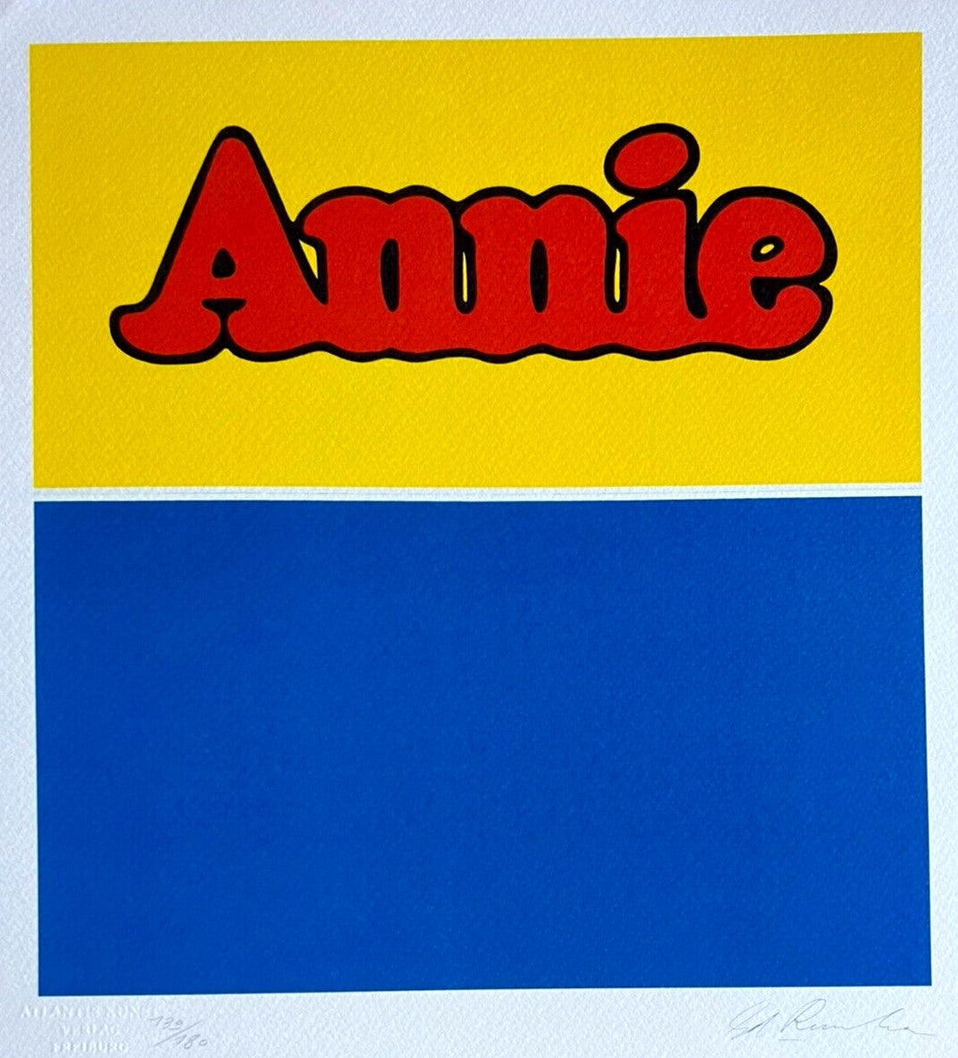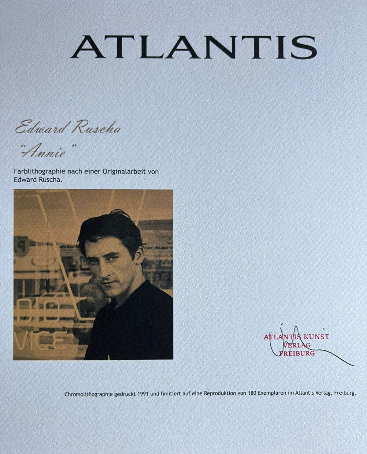Edward Ruscha Lithograph COA Signed Op Numbered By Hand Limited Edward Ruscha "Annie " Chromolithography printed in 1991 in 180 specimens by Atlantis Verlag, Freiburg 30 x 35 cm Signature Edward Ruscha on the slab Dry and authentic stamp of the publishing house Atlantis Kunst Verlag Freiburg Edward Ruscha "Annie" Chromolithography printed in 1991 in 180 specimens by Atlantis Verlag, Freiburg 30 x 35 cm Signature Edward Ruscha on the slab Dry and authentic stamp of the publishing house Atlantis Kunst Verlag Freiburg