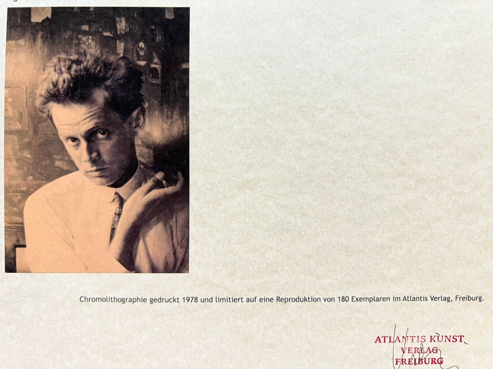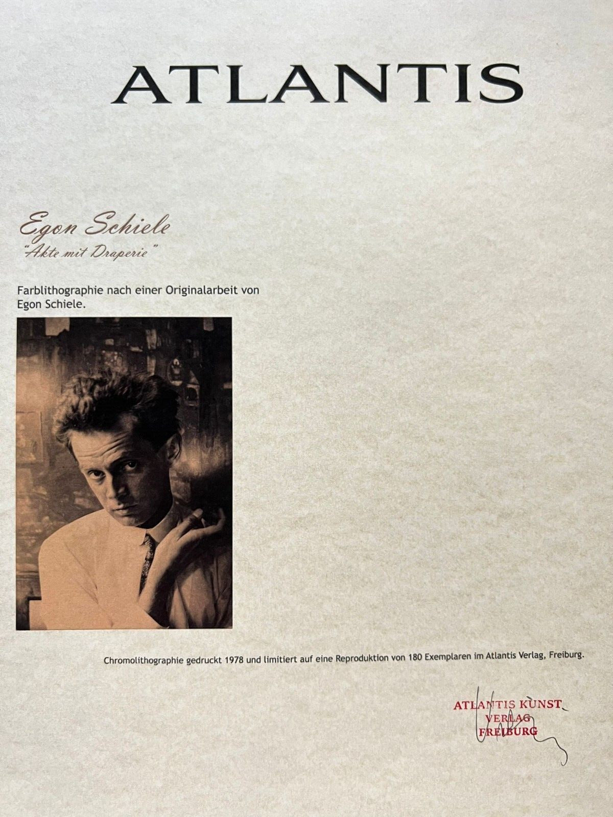 Egon Schiele Lithograph C.O.A. Signed In Pen Numbered In Pencil Crayon (!80) Egon Schiele "Portrait of boyfriend " Chromolithography printed in 1978 in 180 specimens by Atlantis Verlag, Freiburg 30 x 47 cm Signature Egon Schiele on the slab Dry and authentic stamp of the publishing house The progressive number could be different from the published one. Atlantis Kunst Verlag Freiburg Egon Schiele "Portrait of boyfriend" Chromolithography printed in 1978 in 180 specimens by Atlantis Verlag, Freiburg 30 x 47 cm Signature Egon Schiele on the slab Dry and authentic stamp of the publishing house The progressive number could be different from the published one. Atlantis Kunst Verlag Freiburg