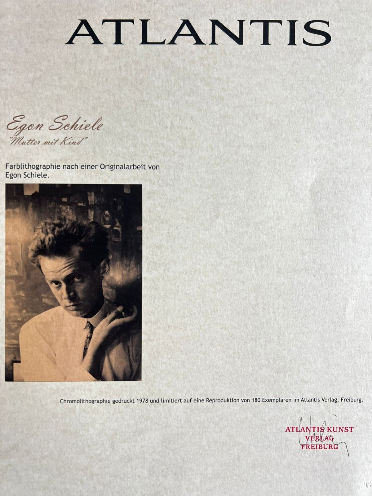Egon Schiele Lithograph C.O.A. Signed In Pen Numbered In Pencil Rare Egon Schiele "Mother with child" Chromolithography printed in 1978 in 180 specimens by Atlantis Verlag, Freiburg 30 x 40 cm Signature Egon Schiele on the slab Dry and authentic stamp of the publishing house The progressive number could be different from the published one. Atlantis Kunst Verlag Freiburg Egon Schiele "Mother with child" Chromolithography printed in 1978 in 180 specimens by Atlantis Verlag, Freiburg 30 x 40 cm Signature Egon Schiele on the slab Dry and authentic stamp of the publishing house The progressive number could be different from the published one. Atlantis Kunst Verlag Freiburg