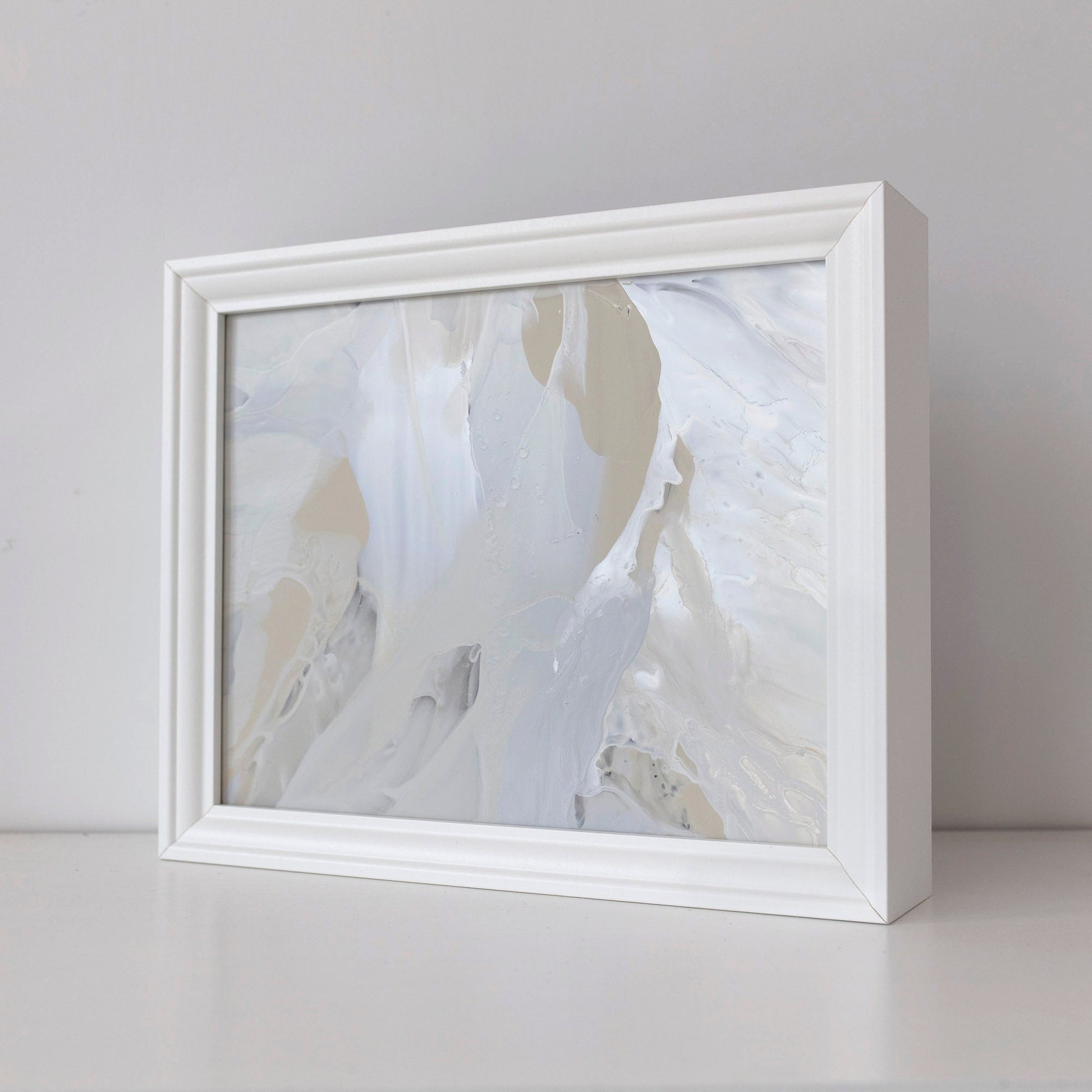 Created on clear plexi and framed in a deep white frame. Artist signature on back. Comes ready to hang or display on a shelf.