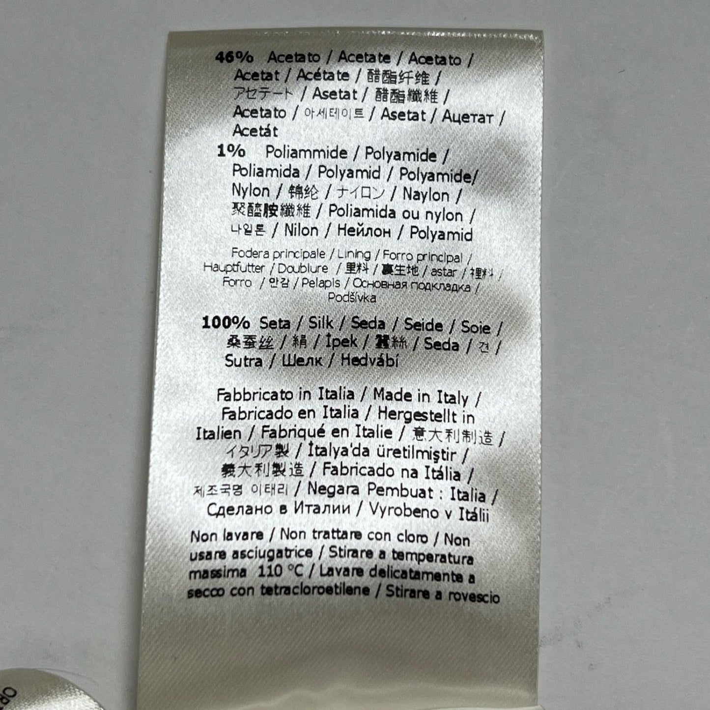 Material: Outer: 53% Viscose (Rayon), Main: 46% Acetate, Outer: 1% Nylon, Lining: 100% Silk