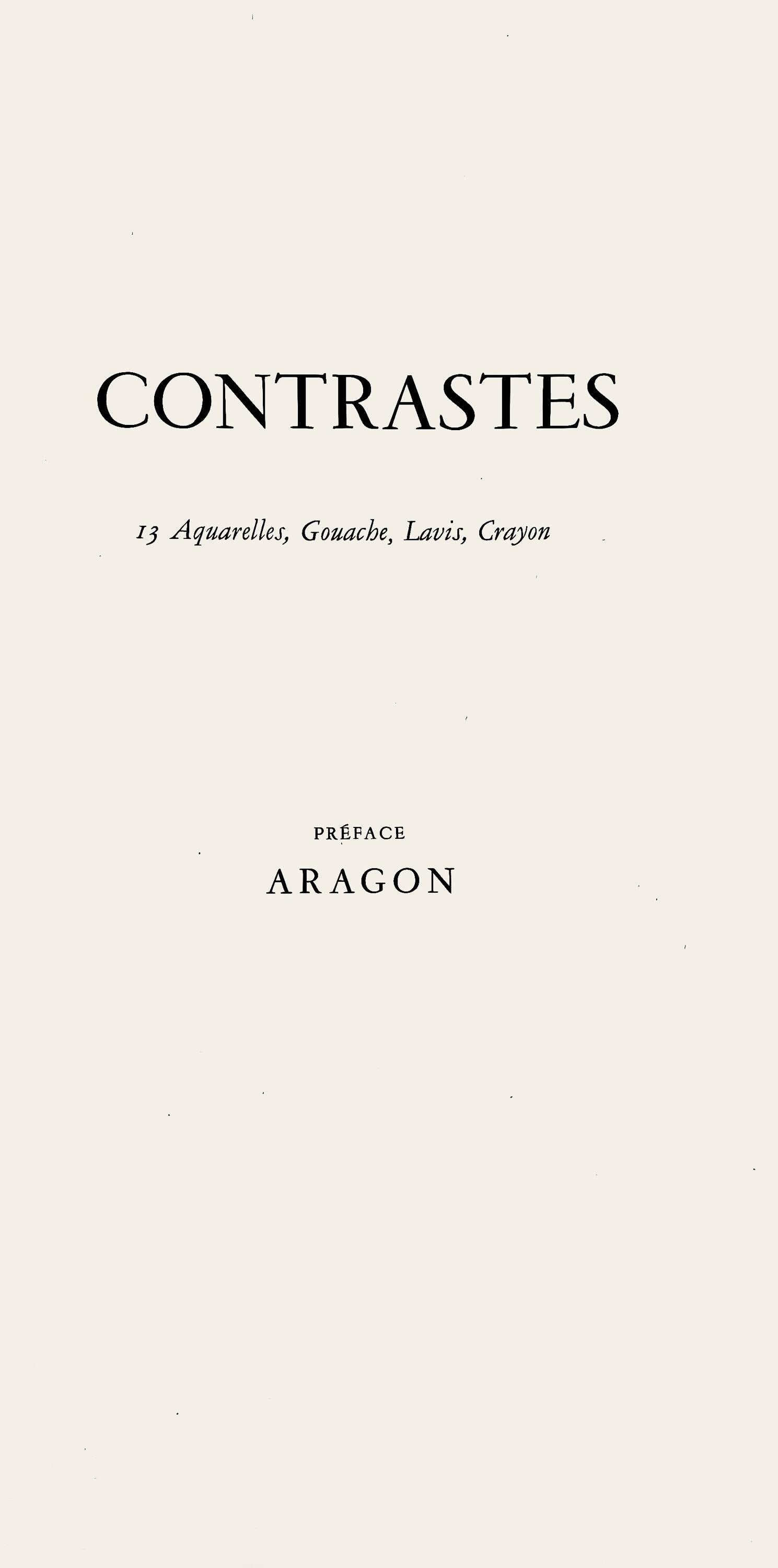 Lithograph and stencil on papier a la cuve du moulin Richard de Bas spcialement filigran pour cette dition paper. Paper size: 15.25 x 20.25 inches. Excellent condition. Inscription: signed in the plate and unnumbered, as issued. Notes: From the folio, Contrastes, 13 Aquarelles, Gouache, Lavis, Crayon, 1959. Published by Au Vent D'Arles, Paris; printed by Ateliers Daniel Jacomet, Paris, June 10, 1959. Excerpted from the folio (translated from French), Contrasts was made......