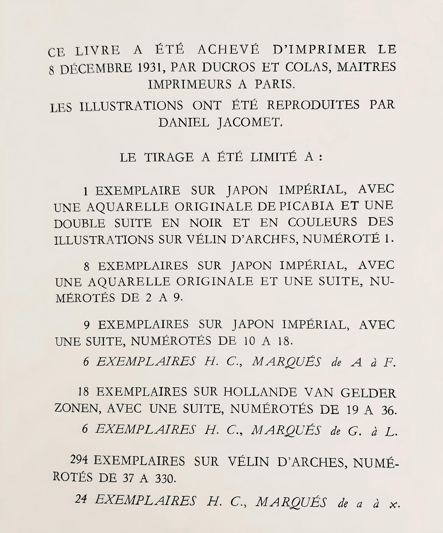Lithograph and stencil on vlin d'Arches paper. Inscription: Unsigned and unnumbered, as issued. Paper Size: 10.3125 x 8.75 inches. Excellent condition. Notes: From the volume, Le Peseur d'mes, prcd d'un frontispice et suivi de huit illustrations de Francis Picabia, 1931. Published by Antoine Roche, diteur, Paris; printed by Daniel Jacomet et Cie, Paris, December 8, 1931. Excerpted from the folio (translated from French), Printing of this book has been finished on Decem......
