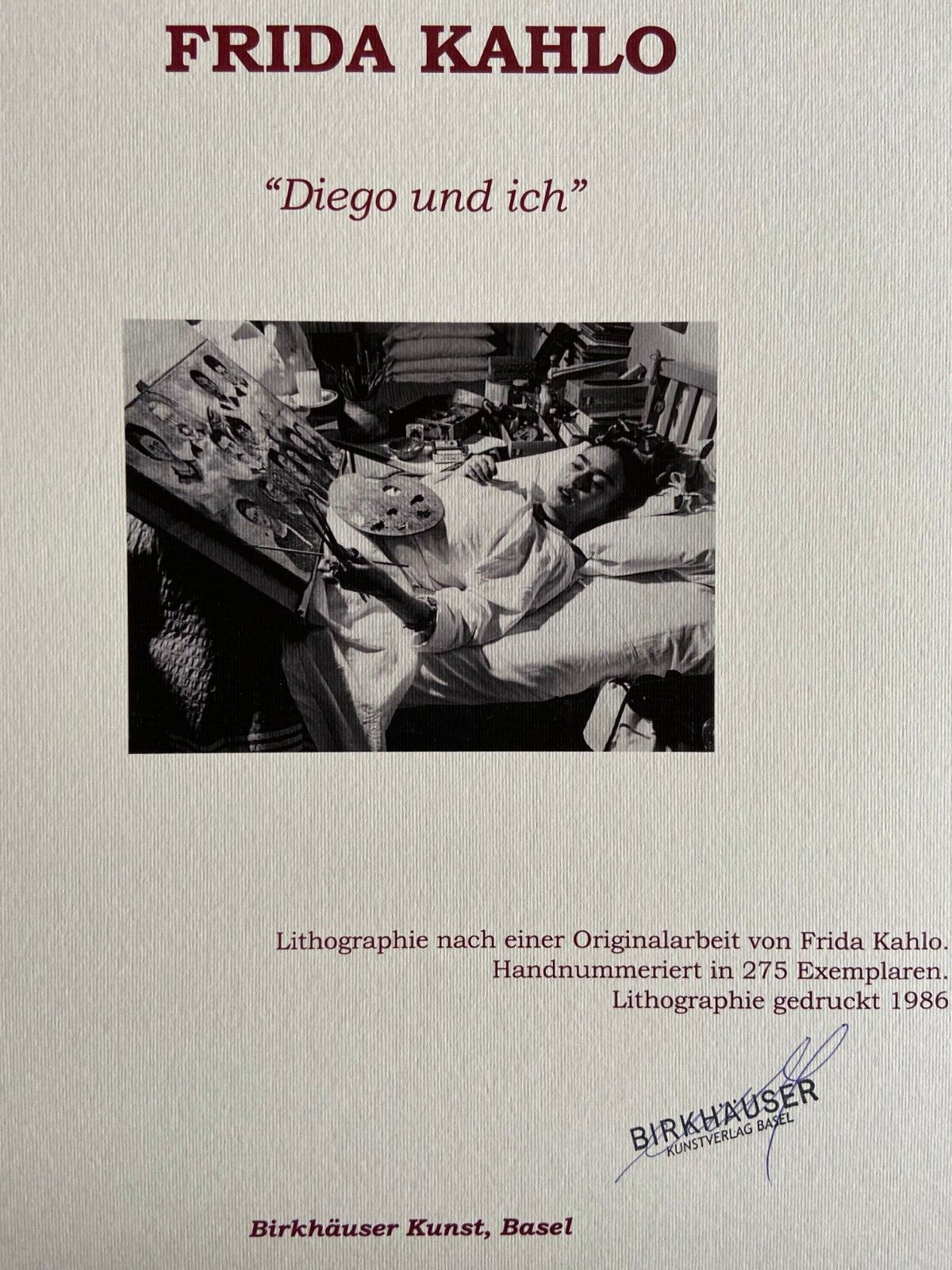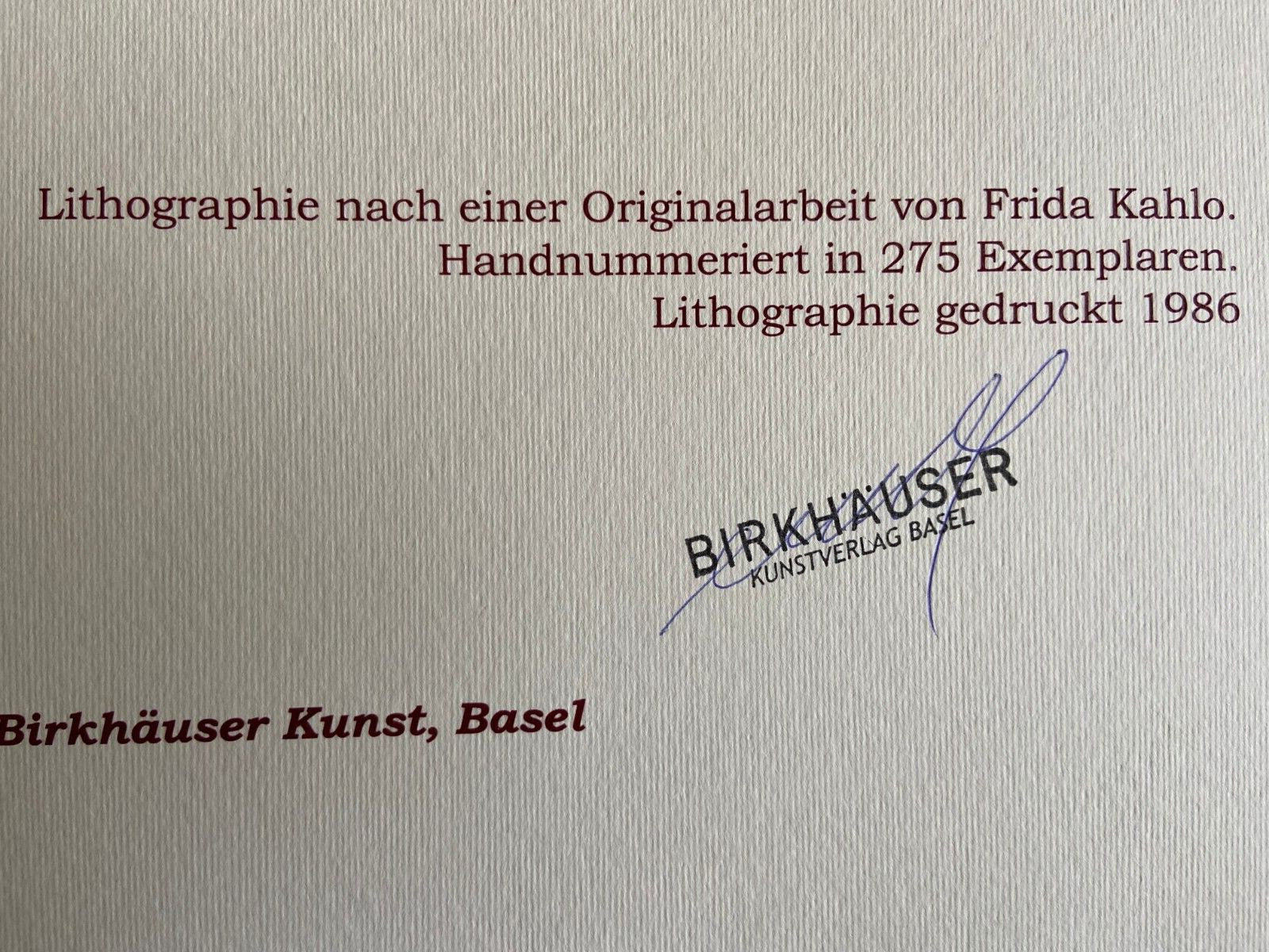 Frida Kahlo Diego and me Lithograph of an work by Frida Kahlo, printed in 1986 30 x 41 cm 275 hand-numbered copies signed Frida Kahlo on the plate Birkhuser Kunstverlag, Basel Frida Kahlo Diego and me Lithograph of an work by Frida Kahlo, printed in 1986 30 x 41 cm 275 hand-numbered copies signed Frida Kahloon the plate Birkhuser Kunstverlag, Basel