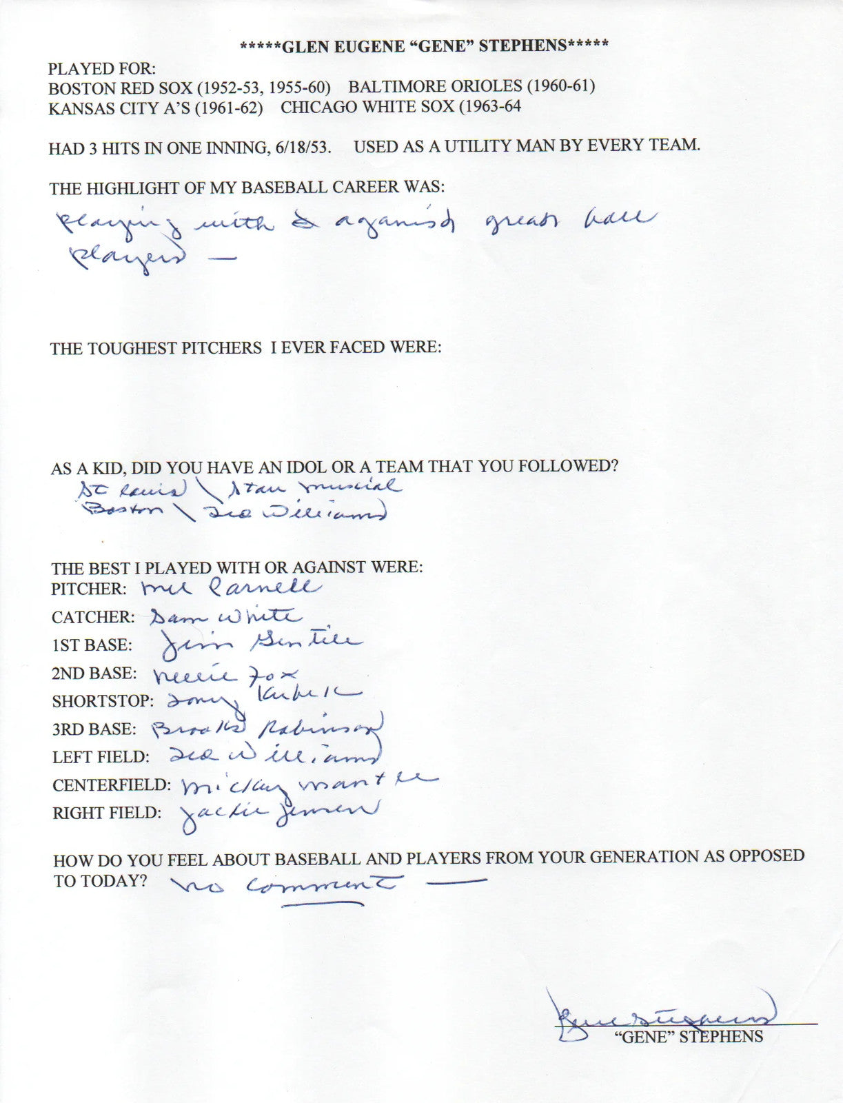 Gene Stephens Autographed Hand Filled Out Survey Page (Jsa)