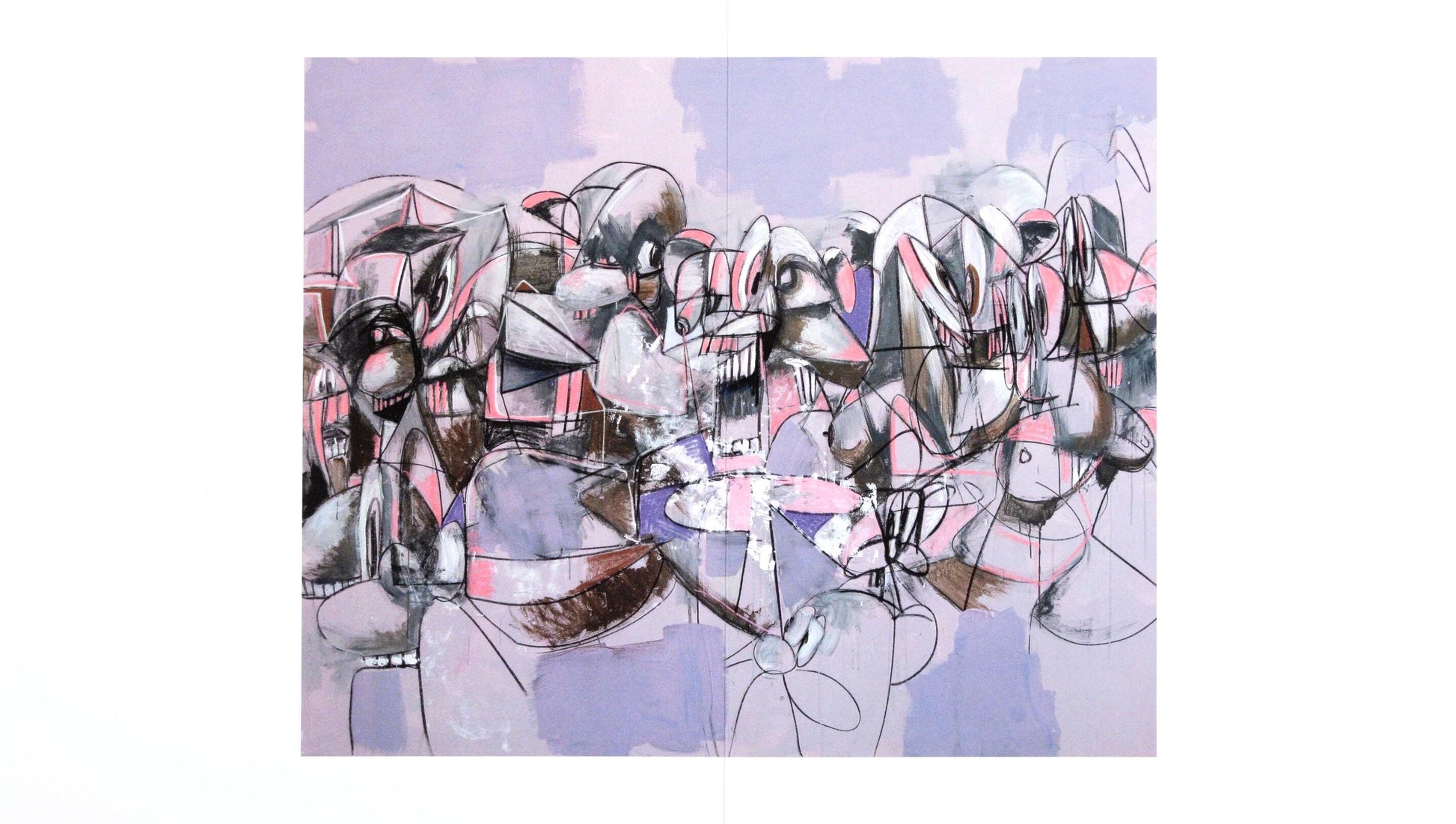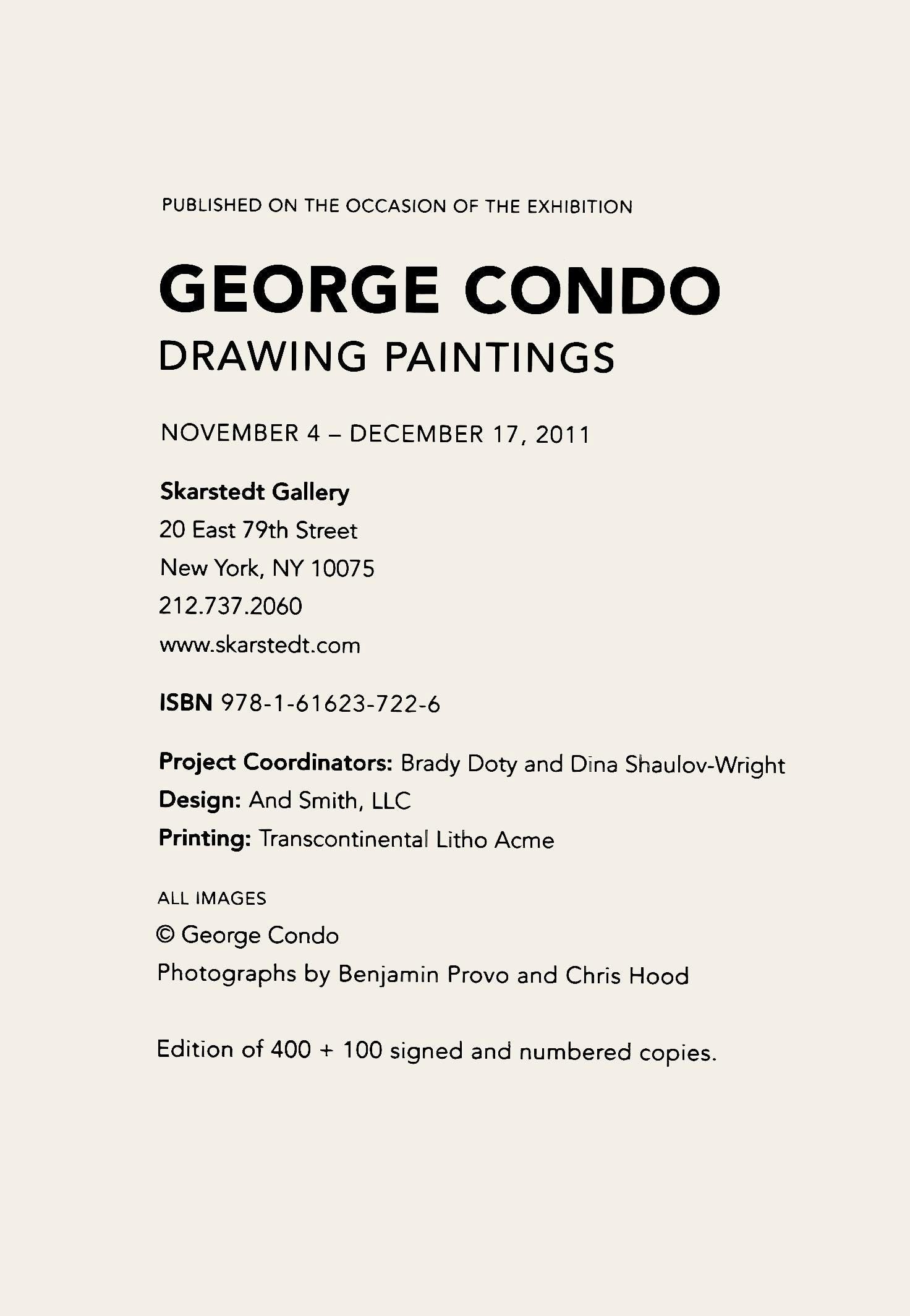 Four color process print on vlin paper. Paper size: 10.75 x 18.50 inches. Excellent condition, with centerfold, as issued. Inscription: Unsigned and unnumbered, as issued. Notes: From the folio, George Condo, Drawing Paintings, 2011. Published by Skarstedt Gallery, New York; printed by Transcontinental Litho Acme, Montral, 2011. Excerpted from the folio, Published on the occasion of the exhibition, George Condo, Drawing Paintings, November 4 - December 17, 2011, Skarstedt Gallery, 20 East 79th Street, New York, NY 10075. Project Coordinators: Brady Doty and Dina Shaulov-Wright; Design: And Smith, LLC; Printing: Transcontinental Litho Acme. All images George Condo. Photographs by Benjamin Provo and Chris Hood. Edition of CD + C, signed and numbered examples.