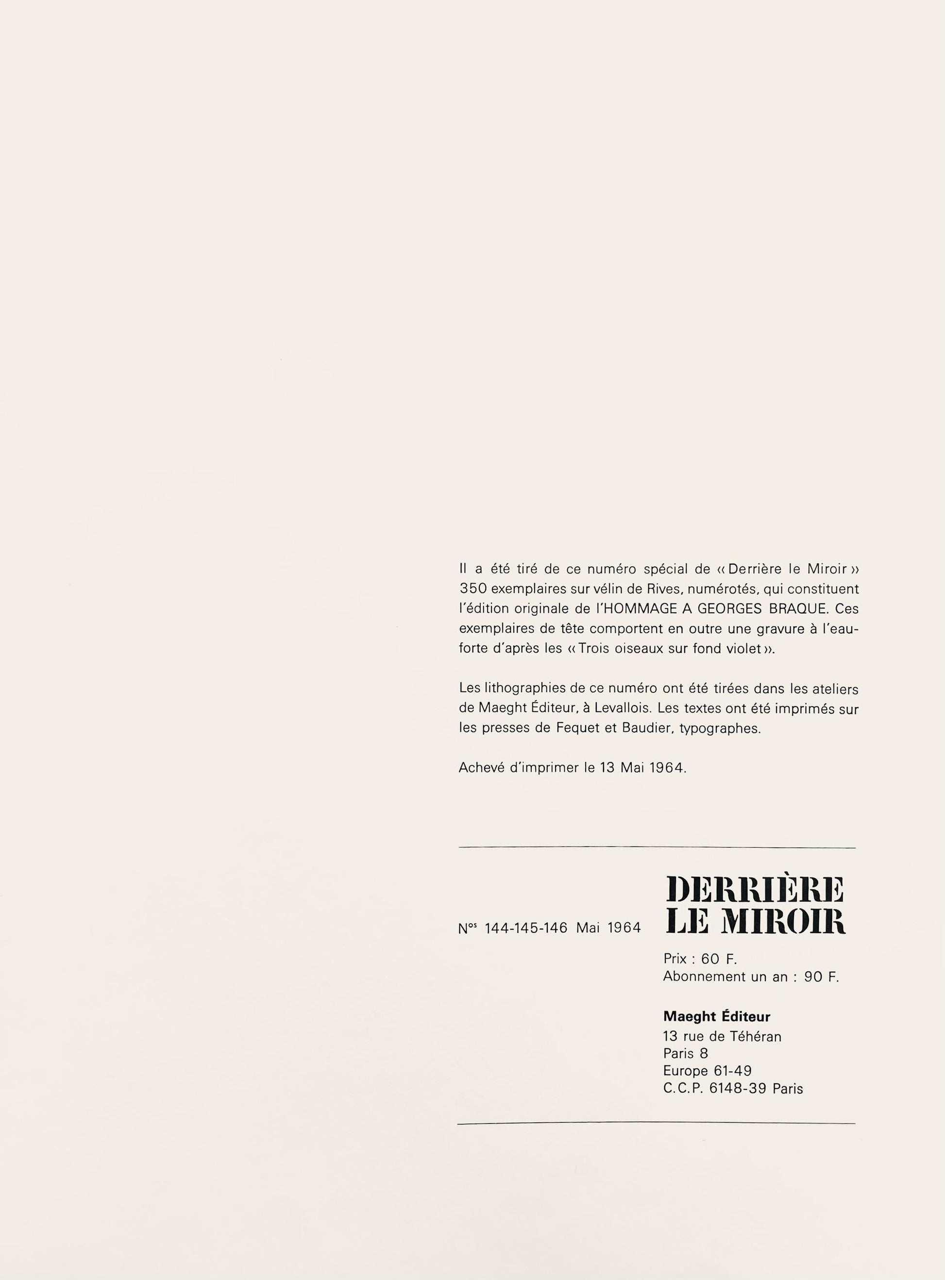 Lithograph on vlin paper. Paper size: 15 x 11 inches. Excellent condition. Inscription: Unsigned and unnumbered, as issued. Notes: From lHommage Georges Braque, Derrire le miroir, N 144-145-146, 1964. Published by Aim Maeght, diteur, Paris; printed by ditions Pierre Feu, Galerie Maeght, Paris. Excerpted from a Christies, New York lot essay, The life span of Derrire le Miroir was thirty-five years. Publication began in 1946. Aim Maeght, initiator of Derrire le Miroir, had already made few attempts to start publications illustrated with fine printed lithographs in colours in the years prior to the launch of Derrire le Miroir. The name, Derrire le Miroir was suggested by Jacques Kober, manager of Galerie Maeght. The gallery had opened in 1945; the first number of Derrire le Miroir was released a year later. For this first issue Geer van Velde was invited to create lithographs to illustrate the publication. The lithographs in the first issue was printed by Mourlot, Paris. The first three issues of Derrire le Miroir were unsuccessful for Maeght as far as the edition sizethe initial print-runs were far too large. From 30,000 for the first issue, the number was taken down to 10,000 for numbers two and three, until Derrire le Miroir number four was published in an edition of 1500. Maeght instituted a policy whereby unsold issues were recycled and used for the fabrication of new paper for the coming editionsthis served to both conserve resources and also usually result in ultimate edition sizes far less than 1,500. With number four, the permanent format for Derrire le Miroir was established. Lithographs in colours were key; text was limited to comments on the featuring artist's exhibition taking place in the Galerie Maeght, and this catalogue format was defining to Derrire le Miroir. Galerie Maeght took on the leading role in Paris and presented all main artists including Braque, Matisse, Chagall, Lger, Bonnard, Chillida and many more. So too did Derrire le Miroir. The idea of a magazine was meanwhile still on the mind of Aim Maeght. He found an insert as a solution. Two, and later four, pages of art review were inserted from 1952 onwards. In 1968 this find had ripened to independency and the dream of Aim Maeght was now a tangible fact named l'Art vivant. Derrire le Miroir was on it's own again. Over 250 issues in a row. At that point publisher Aim Maeght wished to make a mark with the publication of an hommage to all who once contributed to the magazine which came in the form of issue number 250, but was delayed by the death of Aim Maeght. It was published after number 253 in 1982 and became a tribute to Aim and Margurite Maeght and 35 years of friendship with artists and poets. The era of Derrire le Miroir was closed with that final publication.