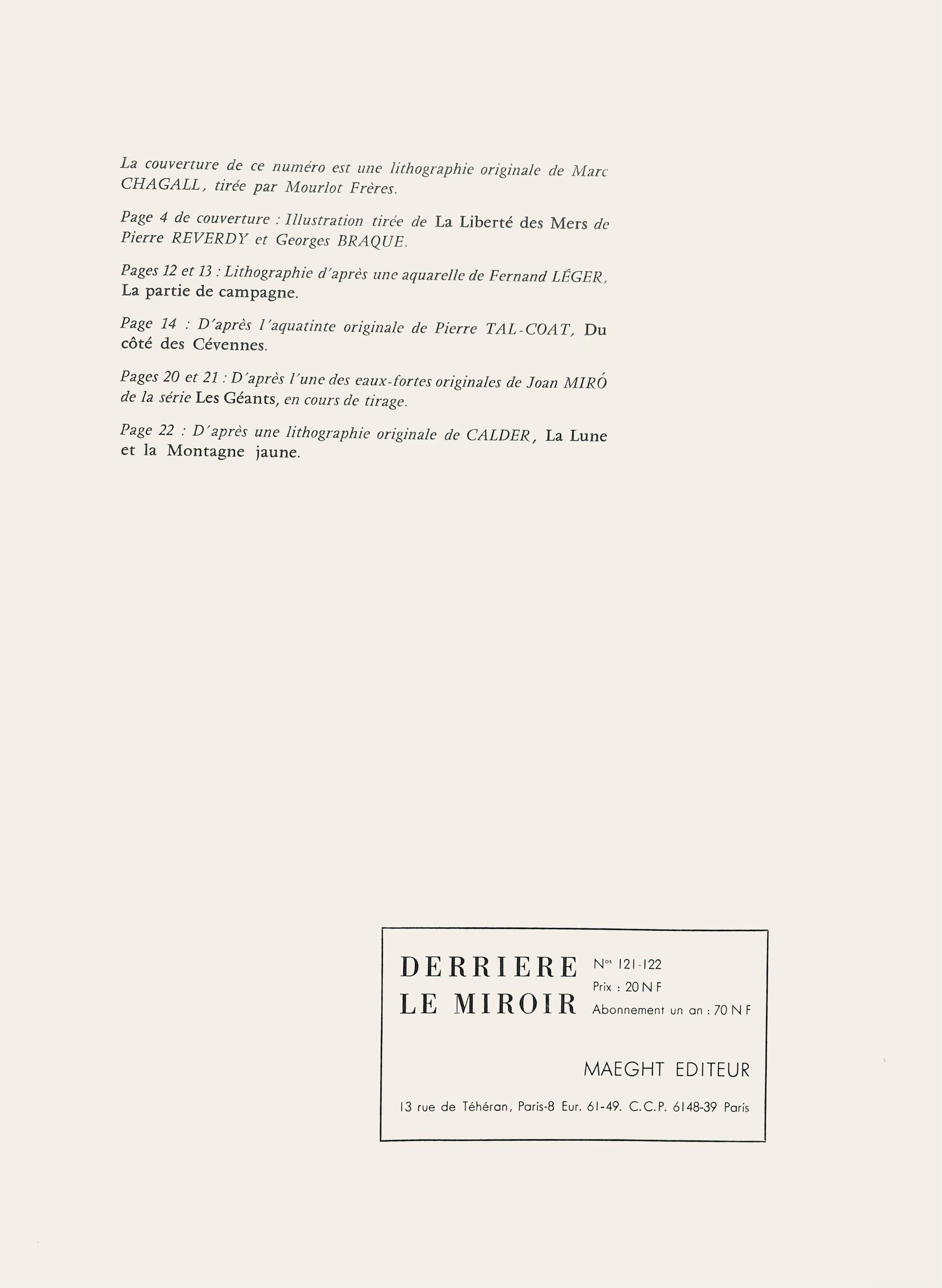 Aim Maeght, initiator of Derrire le Miroir, had already made few attempts to start publications illustrated with fine printed lithographs in colours in the years prior to the launch of Derrire le Miroir.