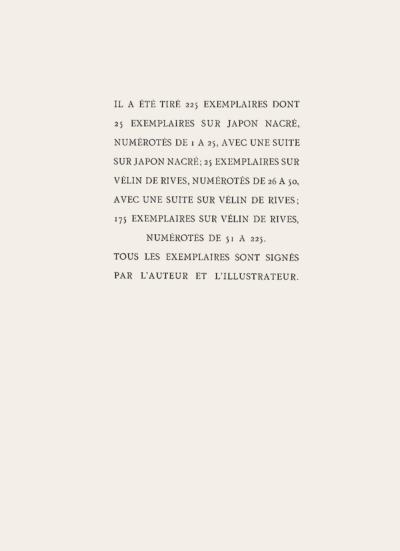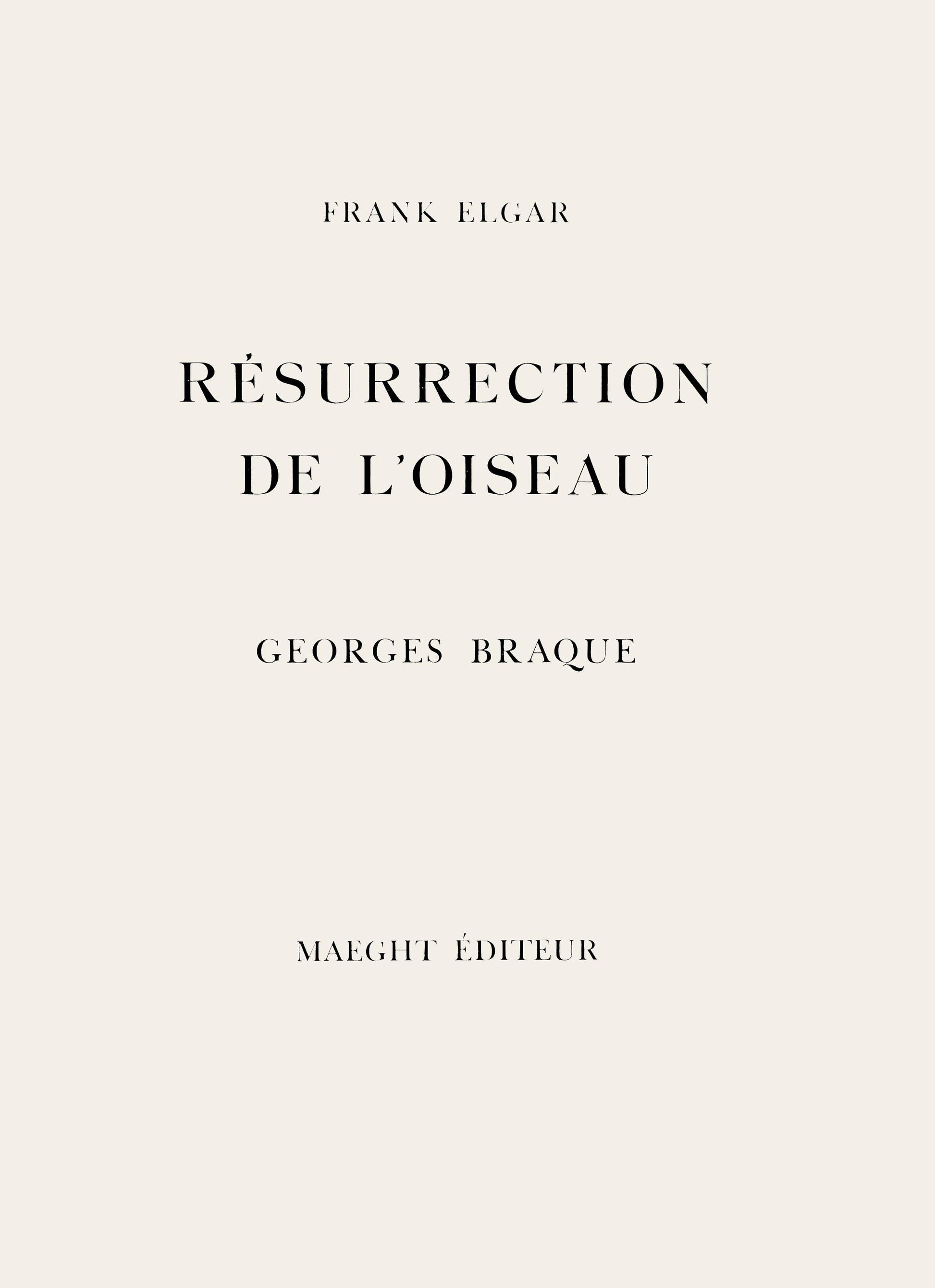 Lithograph on vlin de Rives paper. Paper size: 15.75 x 11.8 inches. Excellent condition. Inscription: unsigned and unnumbered, as issued. Notes: from the folio, Rsurrection de l'oiseau, Georges Braque, 1958. Published by Maeght diteur, Paris; printed by Mourlot Frres, Paris, December 15, 1958. Excerpted from the folio (translated from French), This work, composed in Baskerville c. 24, was completed in Paris on December 15, 1958 on the presses of Fequet et Baudier, typo......