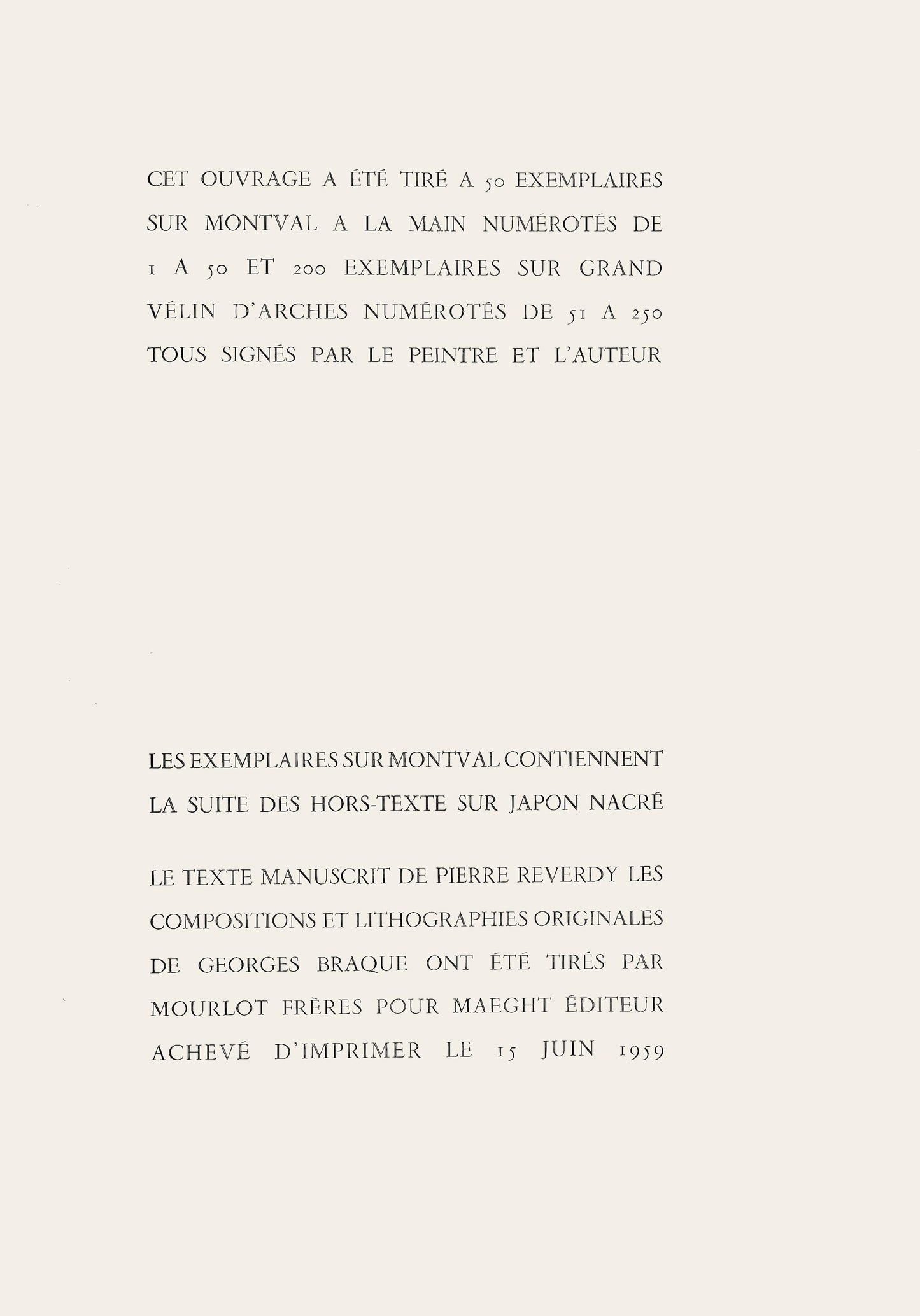 Lithograph on grand vlin d'Arches paper. Paper size: 22.83 x 15 inches. Excellent condition. Inscription: unsigned and unnumbered, as issued. Notes: from the folio, La Libert des Mers, 1959. Published by Maeght diteur, Paris; printed by Mourlot Frres, Paris, June 15, 1959, in an edition of 298. Excerpted from the folio (translated from French), This folio has been drawn in 50 examples on Montval by hand, numbered from 1 to 50, and 200 examples on large vlin d'Arches, numbered from 51 to 250, all signed by the painter and the author on the colophons. The examples on Montval contain the continuation of the hors-texte on Japon nacre. The handwritten text of Pierre Reverdy, the original compositions and lithographies of Georges Braque were drawn by Mourlot Frres for Maeght diteur. Completed to print on June 15, 1959.