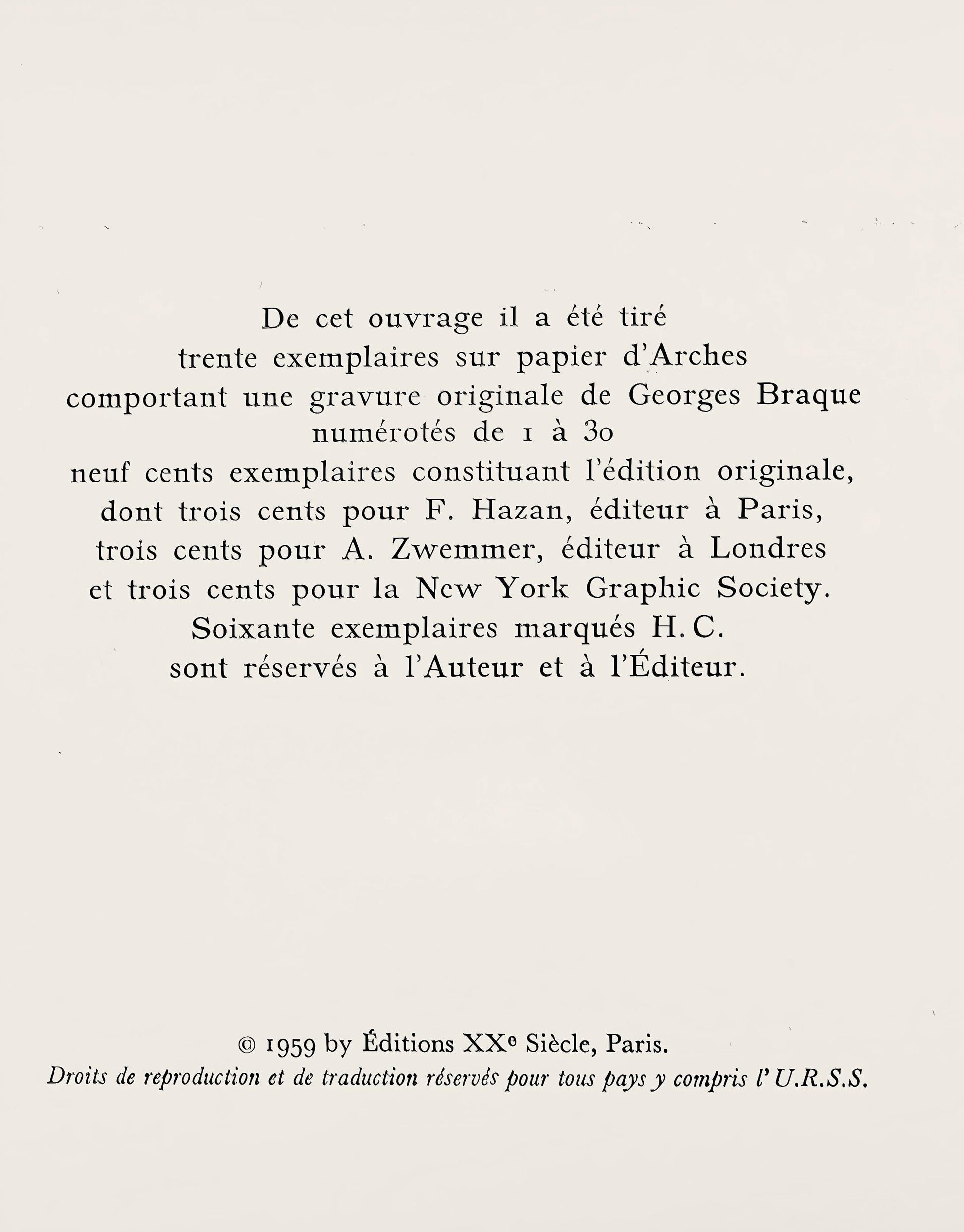 Lithograph on vlin papier d'Arches paper. Paper Size: 7.25 x 9.375 inches. Excellent condition. Unsigned and unnumbered, as issued. Notes: From the volume, Georges Braque le solitaire, 1959. Published by Editions XXe Sicle, Paris and the New York Graphic Society, Greenwich, Connecticut; Printed by L'Imprimerie Union, Paris, 1959. Excerpted from the volume (translated from French), From this volume it was printed XXX examples on papier d'Arches containing an original engraving by Georges Braque numbered from I to CCC examples constituting the original edition, including CCC for Mr. Hazan, publisher in Paris; CCC for A. Zwemmer, published in London; and, CCC for the New York Graphic Society. LX examples of hors commerce. brands are reserved for the author and the publisher.