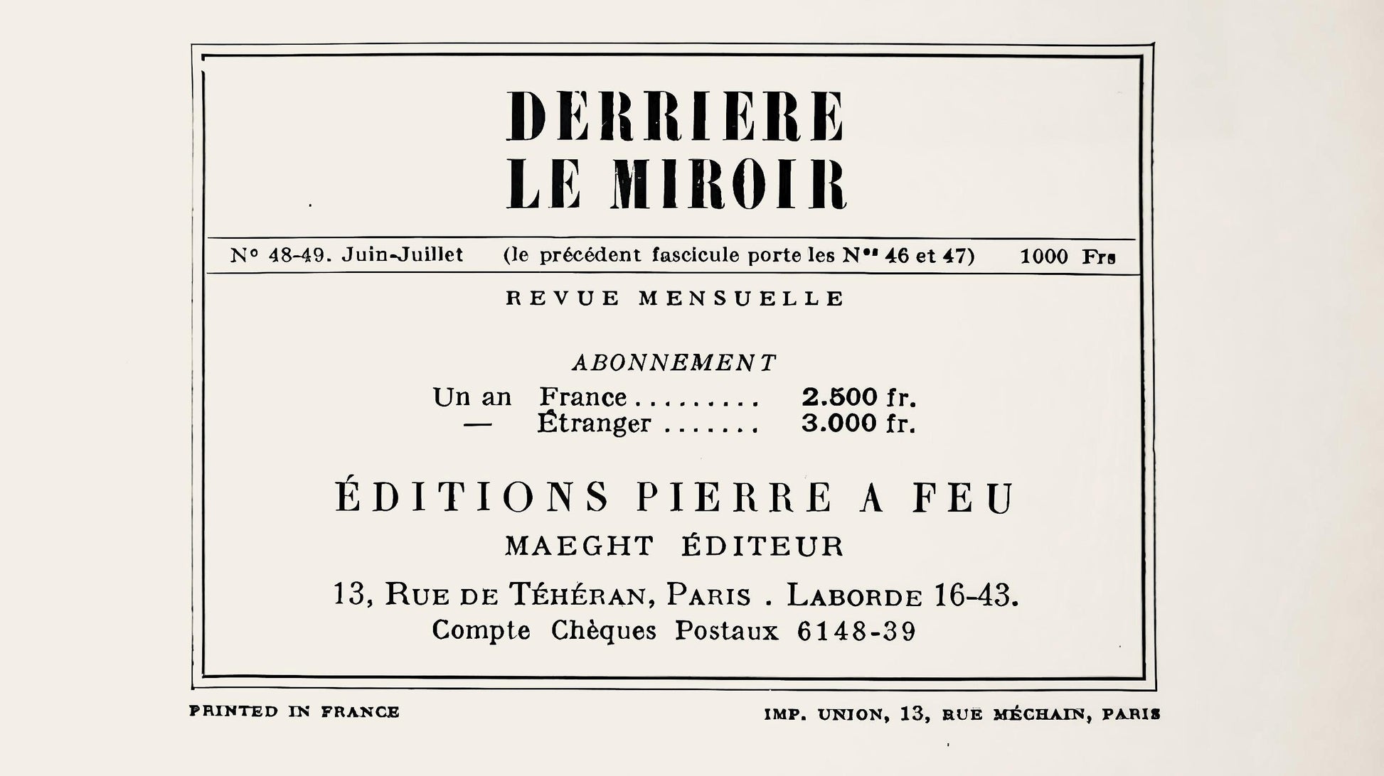The name, Derrire le Miroir was suggested by Jacques Kober, manager of Galerie Maeght.