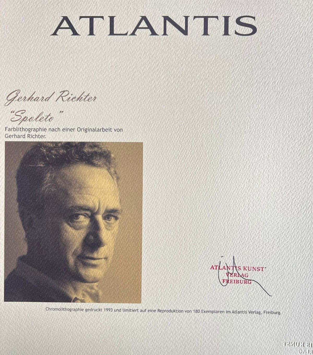 Gerhard Richter Lithograph Signed COA (Hand Numbered) Gerhard Richter "Spoleto " Chromolithography printed in 1993 in 180 specimens by Atlantis Verlag, Freiburg 32 x 34 cm Signature Gerhard Richter on the slab Dry and authentic stamp of the publishing house The progressive number could be different from the published one. Atlantis Kunst Verlag Freiburg Gerhard Richter "Spoleto" Chromolithography printed in 1993 in 180 specimens by Atlantis Verlag, Freiburg 32 x 34 cm Signature Gerhard Richter on the slab Dry and authentic stamp of the publishing house The progressive number could be different from the published one. Atlantis Kunst Verlag Freiburg
