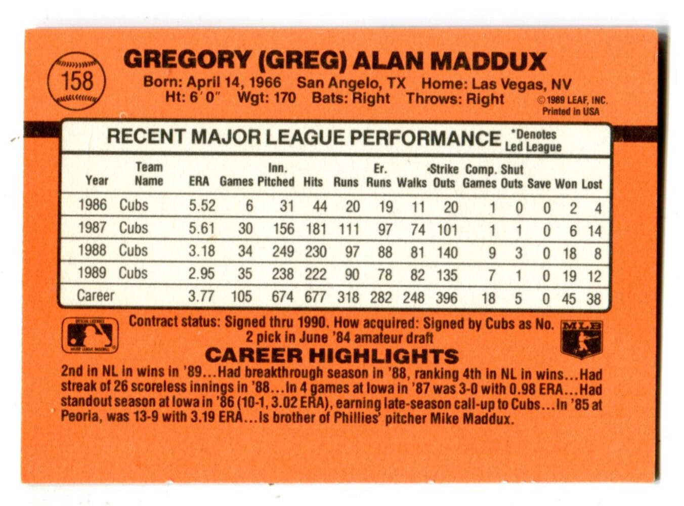Greg Maddux 1990 Donruss Autographed Card #158