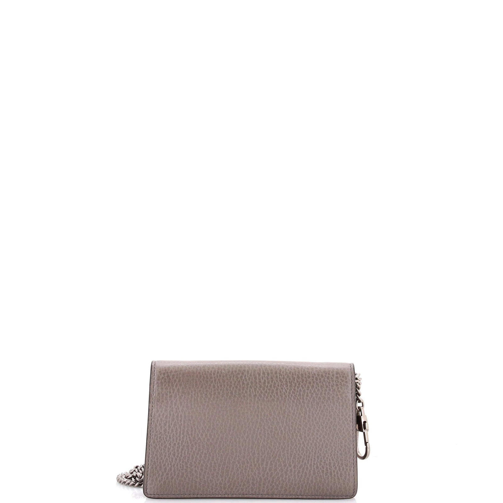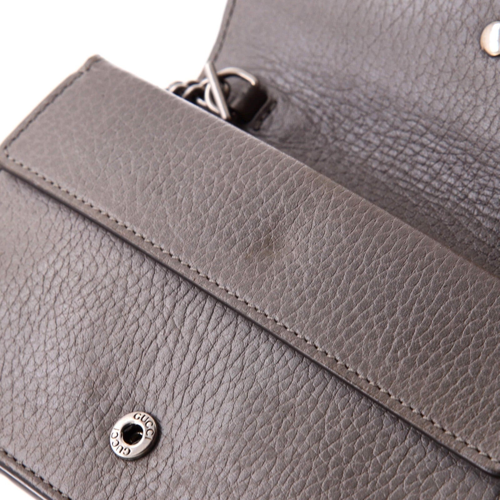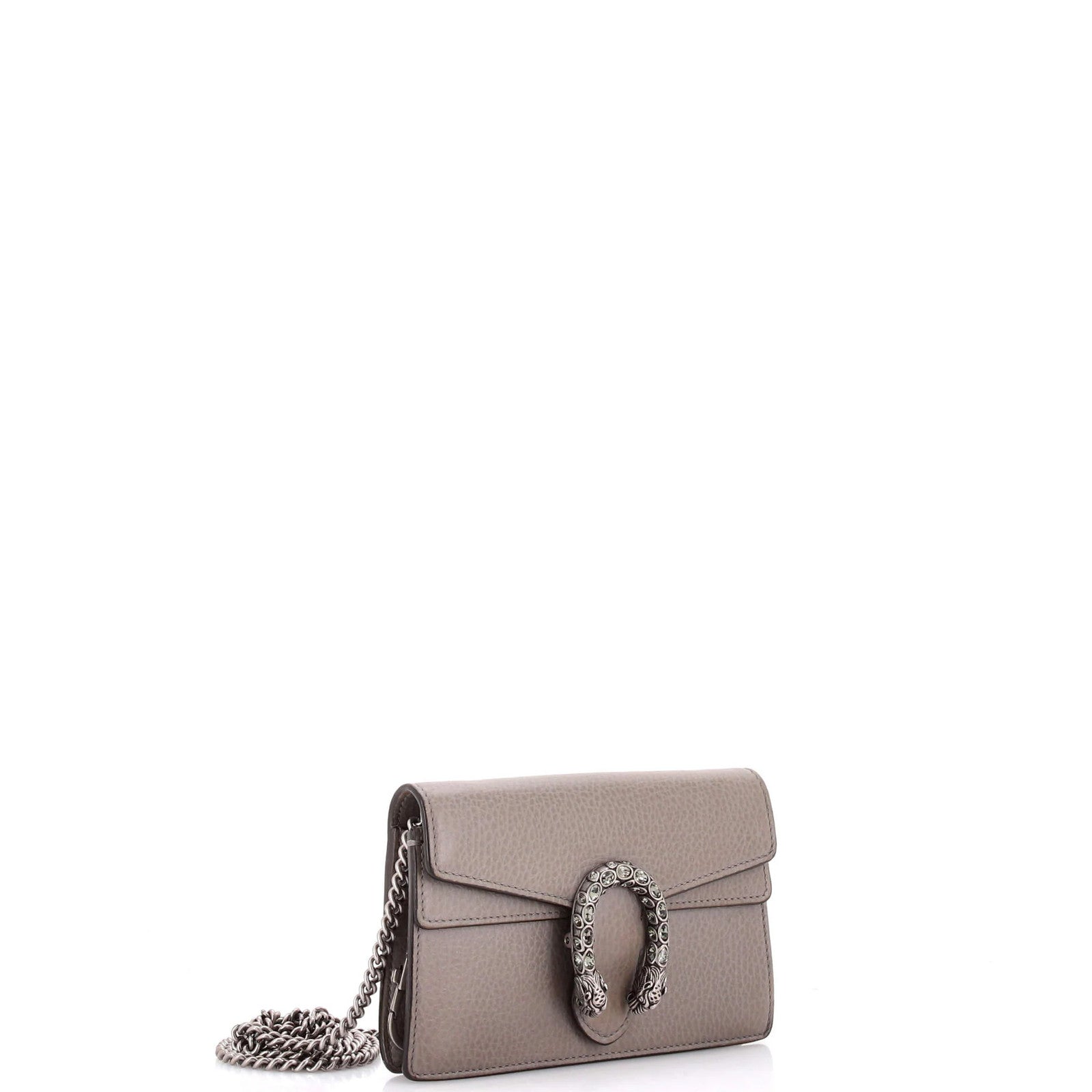 The Gucci Dionysus Super Mini Leather Bag is a chic and compact accessory that exudes luxury. With its sleek gray exterior, suede interior, and aged silver hardware, this super mini clutch is perfect for adding a touch of high-end style to any outfit. Its durable construction and timeless design make it a sought-after addition to any fashion collection.