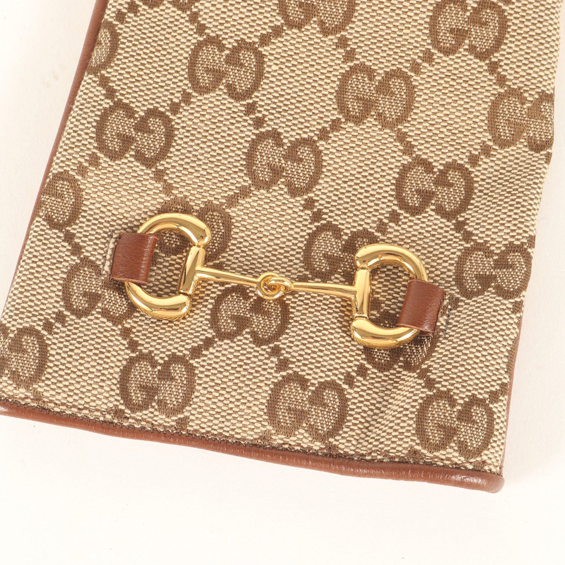 Gucci Men'S Brown Gg Monogram Lamb Leather Gloves With Gold Bits