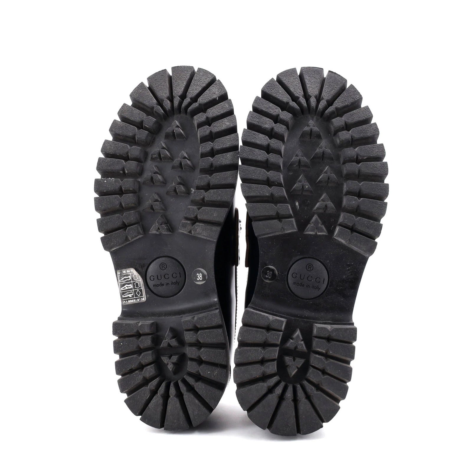 Condition: Great. Minor creasing and scuffs throughout, minor darkening and marks in interior, discoloration, scuffs, and minor peeling on outer soles, scratches on hardware.