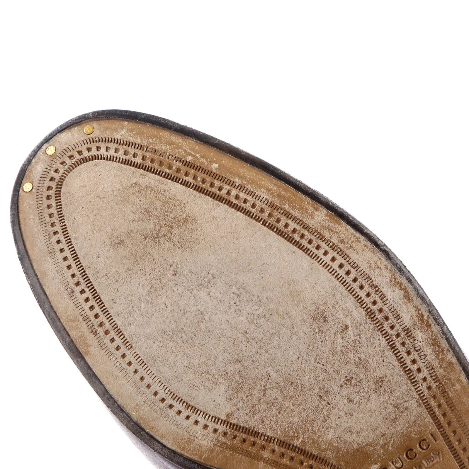 Condition: Very good. Creasing and scuffs throughout, marks in interior, minor lifting on insoles, heavy peeling, scuffs, and indentations on outer soles, scratches on hardware.