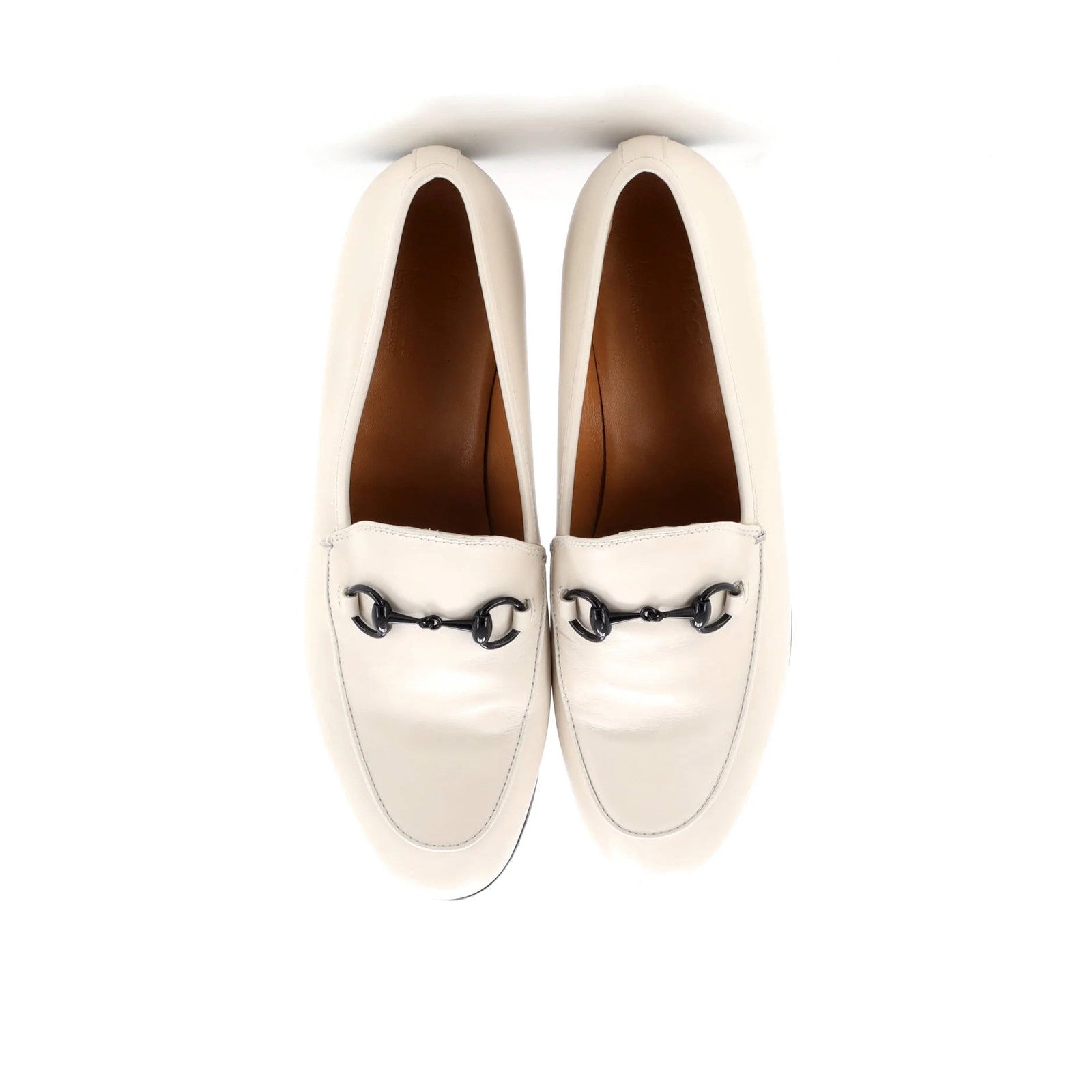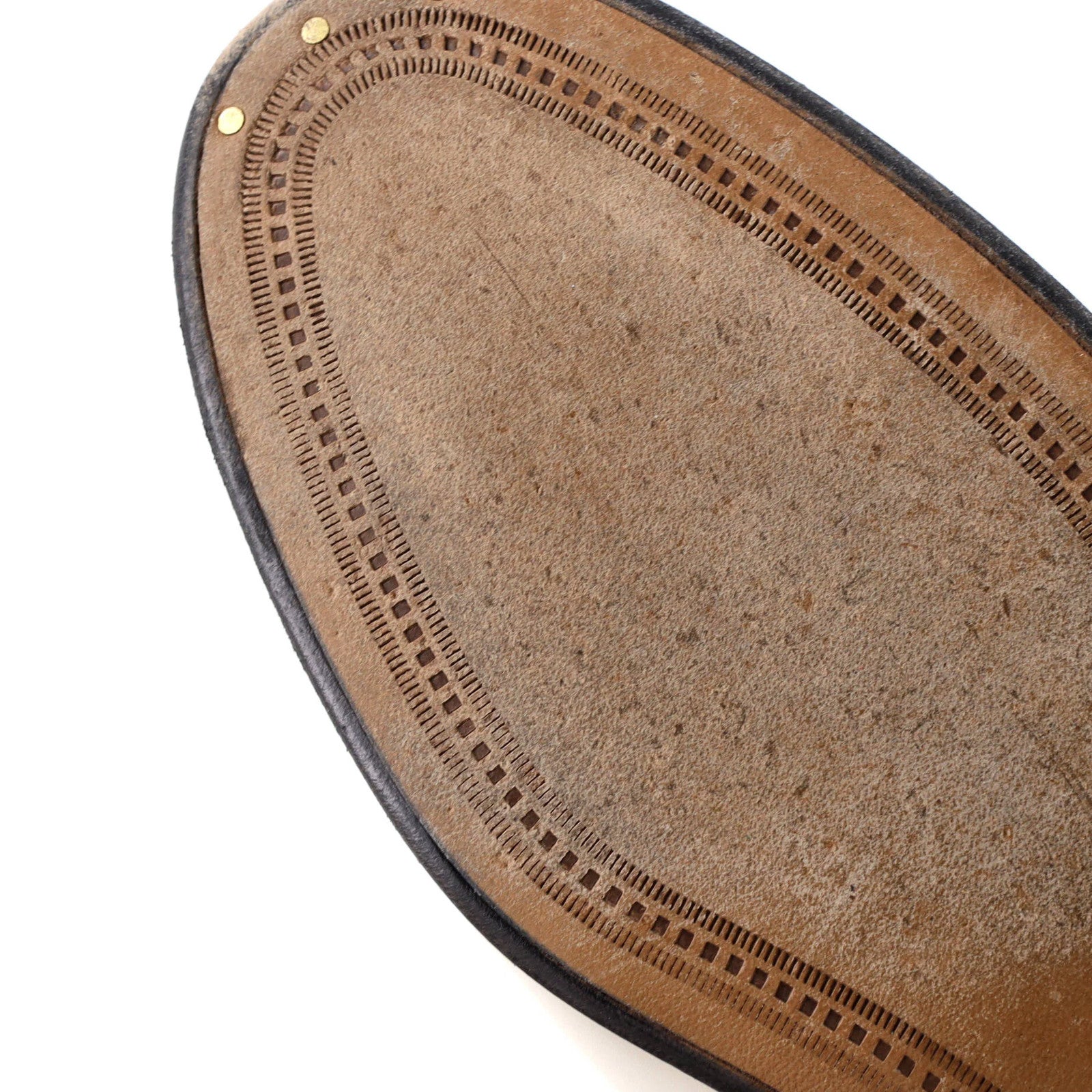 Condition: Very good. Creasing and scuffs throughout, marks in interior, moderate peeling, discoloration, scuffs, and indentations on outer soles, scratches on hardware.