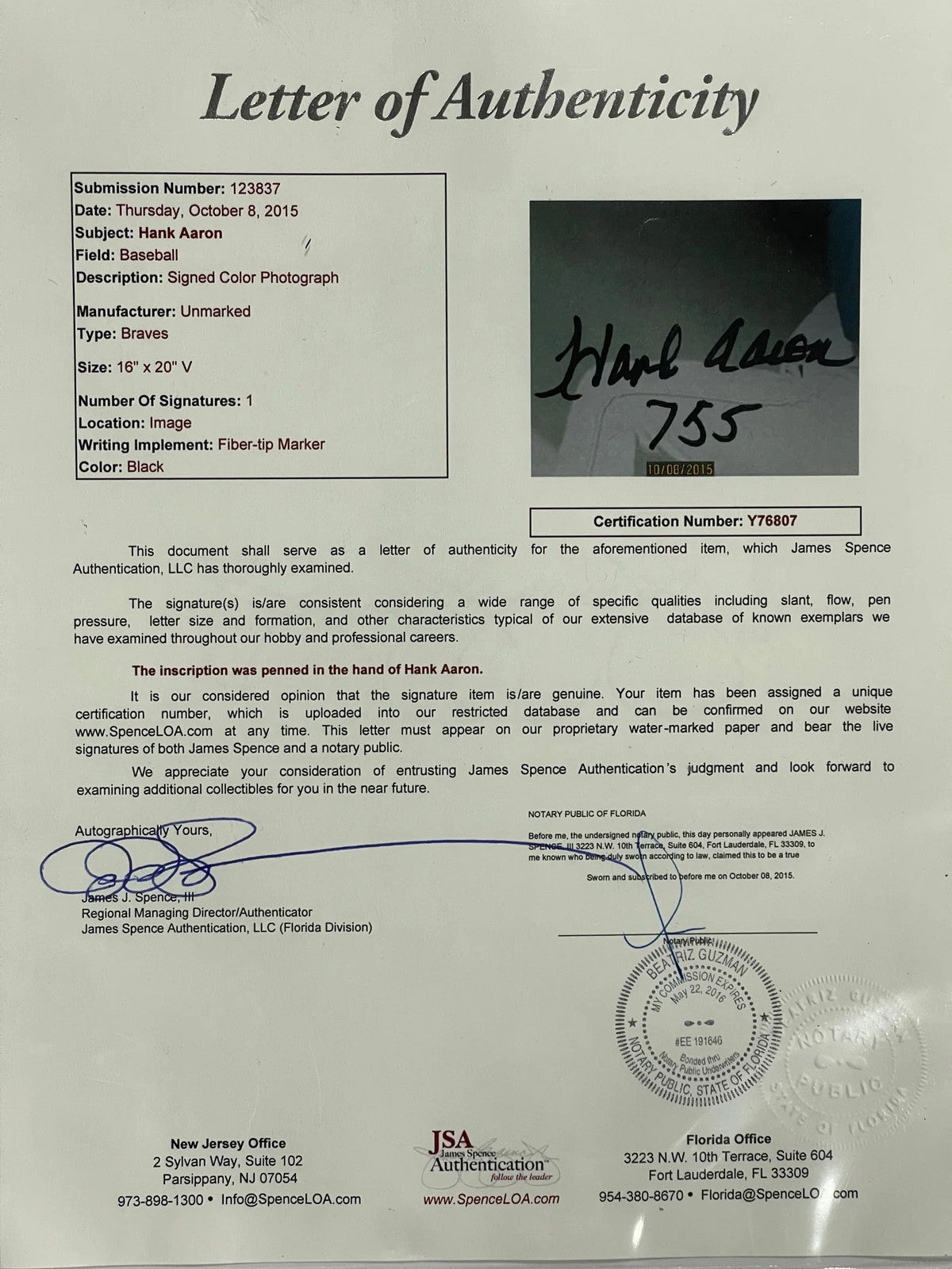 Signed in black sharpie across the front of the photo with inscrption "755".