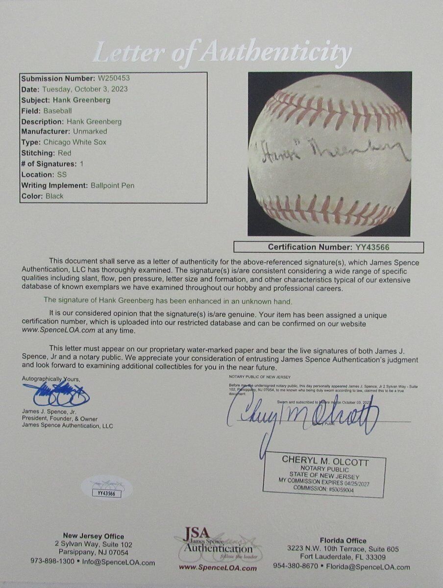 Hank Greenberg Hof Signed/Autographed White Sox
