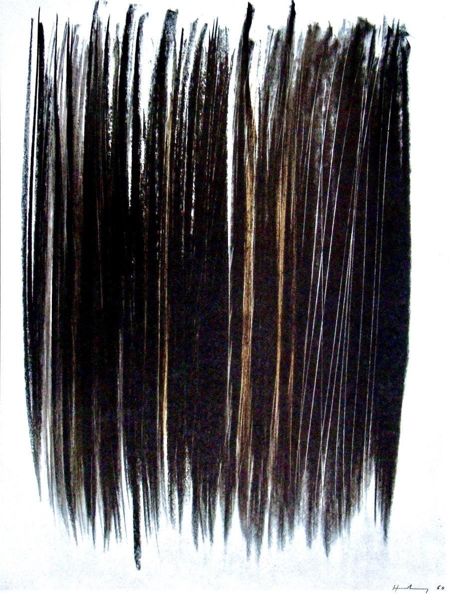 HANS HARTUNG (1904-1989) was a German-French painter, known for his gestural abstract style. He was also a decorated World War II veteran of the Legion d'honneur. Hartung's freewheeling abstract paintings set influential precedents for many younger American painters of the 1960s, making him an important forerunner of American Lyrical Abstraction of the 1960s and 1970s. He was featured in the 1963 film documentary School of Paris: (5 Artists at Work) by American filmmaker Warren Forma.