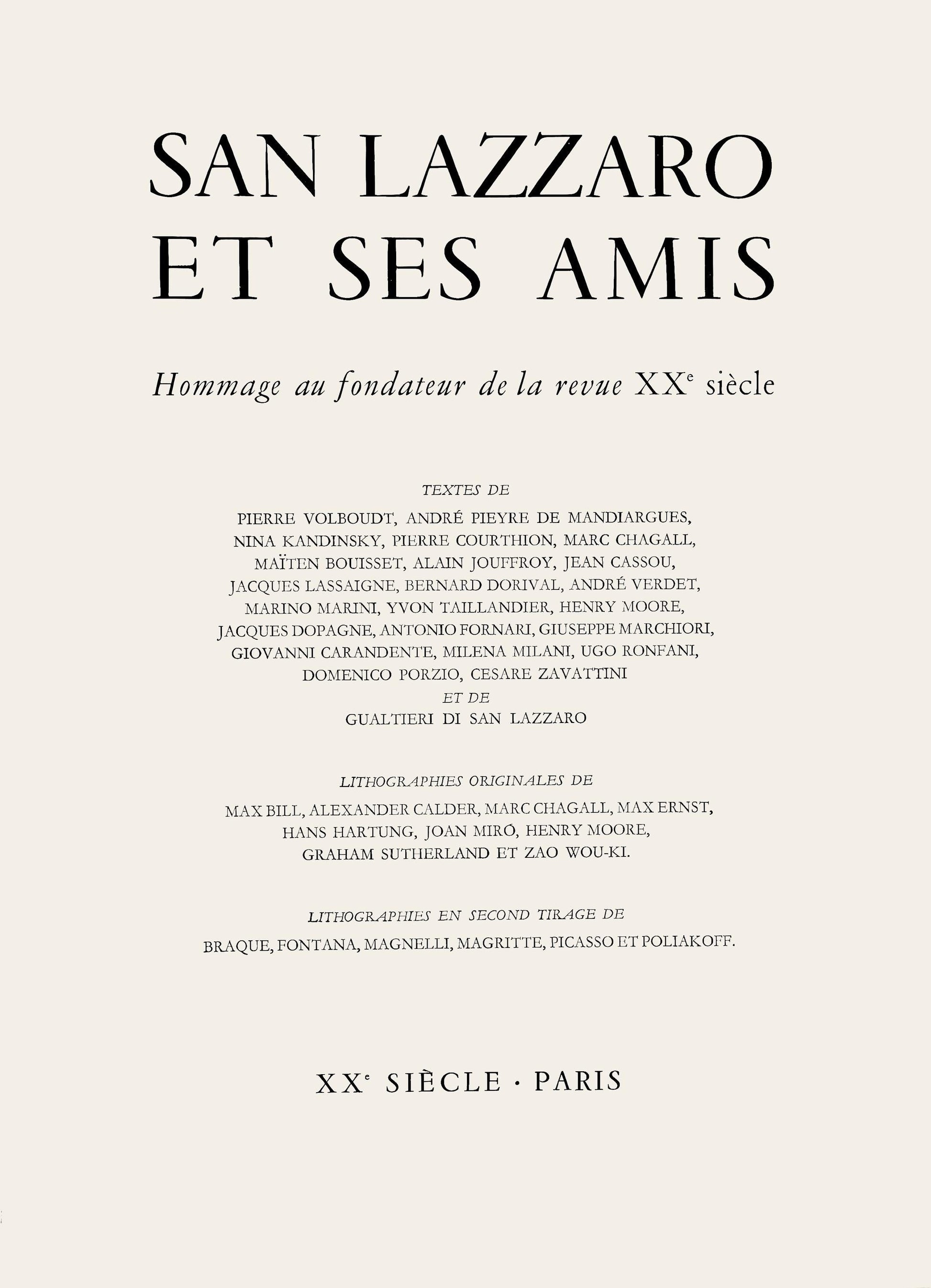 Suffering from failing health, in 1968 San Lazzaro lost overall control of XXe Sicle to Lon Amiel, a printer-publisher who had provided financial backing and helped with distribution in America." Thematic issues now ceased and were replaced by a 'panorama' of the year, but San Lazzaro was still active as a publisher of books and albums of prints.Shortly after his death, San Lazzaro himself was the subject of two exhibitions: 'Omaggio a XXe Sicle' in Milan in December 1974 centred on graphic work by those artists closest to him late in life, while 'San Laz-zaro et ses Amis' at the Muse d'Art Moderne de la Ville de Paris in 1975 featured work by all those whose work he had promoted for more than 50 years: Arp, Calder (1898-1976), Capogrossi, Chagall, Sonia Delau-nay, Dubuffet, Estve, Lucio Fontana (1899-1968), Gili-oli (1911-77), Magnelli, Marini, Mir, Moore and Poliakoff. This exhibition was seen by one of his closest colleagues as an indirect portrait of San Lazzaro, a complex man whose modesty and reserve masked his unremitting drive to extend international appreciation of contemporary art, and to bring the reading public closer to its making through the medium of print.
