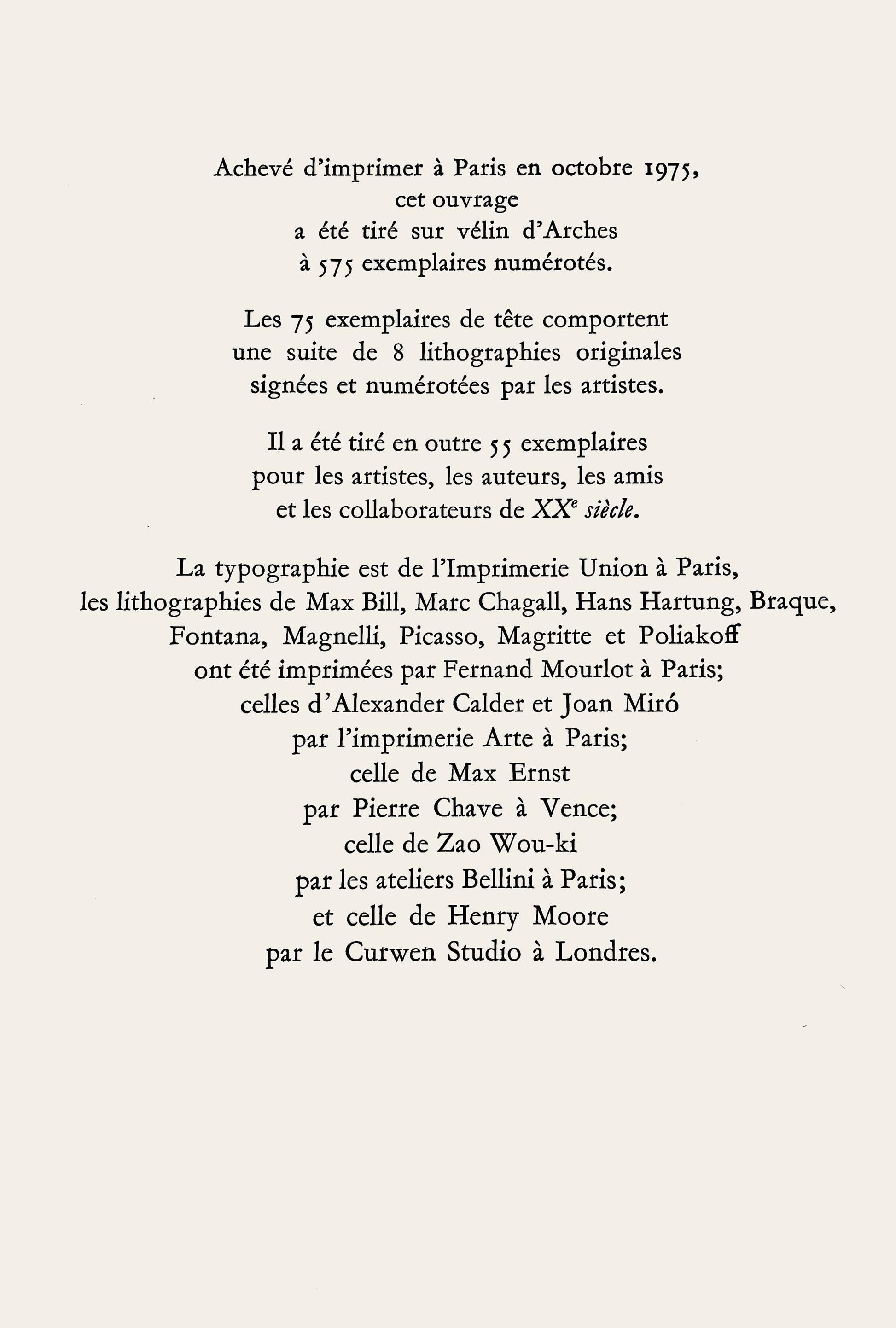 The typography is from l'Imprimerie Union in Paris; the lithographs of Max Bill, Marc Chagall, Hans Hartung, Braque, Fontana, Magnelli, Picasso, Magritte and Poliakoff were printed by Fernand Mourlot in Paris; those of Alexander Calder and Joan Mir by l'imprimerie Arte in Paris; that of Max Ernst by Pierre Chave in Vence; that of Zao Wou-ki by ateliers Bellini in Paris; and that of Henry Moore by the Curwen Studio in London.