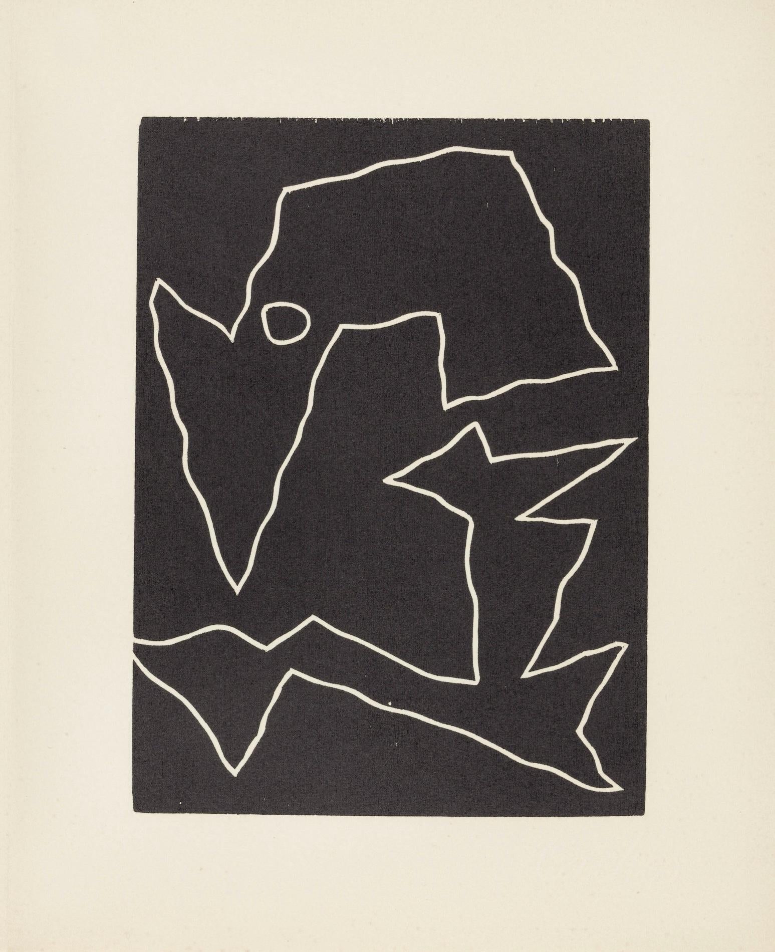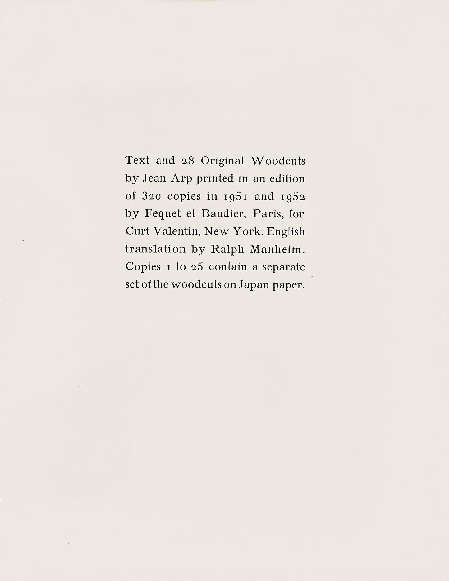 Woodcut on vlin dArches paper. Paper size: 11.25 x 8.875 inches. Excellent condition. Inscription: Unsigned and unnumbered, as issued. Notes: From the folio, Jean Arp, Dreams and Projects, 1951-1952, 1952. Published by Curt Valentin, New York; printed by Fequet et Baudier, Paris, 1952. Excerpted from the folio, Text and 28 original woodcuts by Jean Arp printed in an edition of 320 examples in 1951 and 1952 by Fequet et Baudier, Paris, for Curt Valentin, New York. English translation by Ralph Manheim. Examples 1 to 25 contain a separate set of the woodcuts on Japon paper.