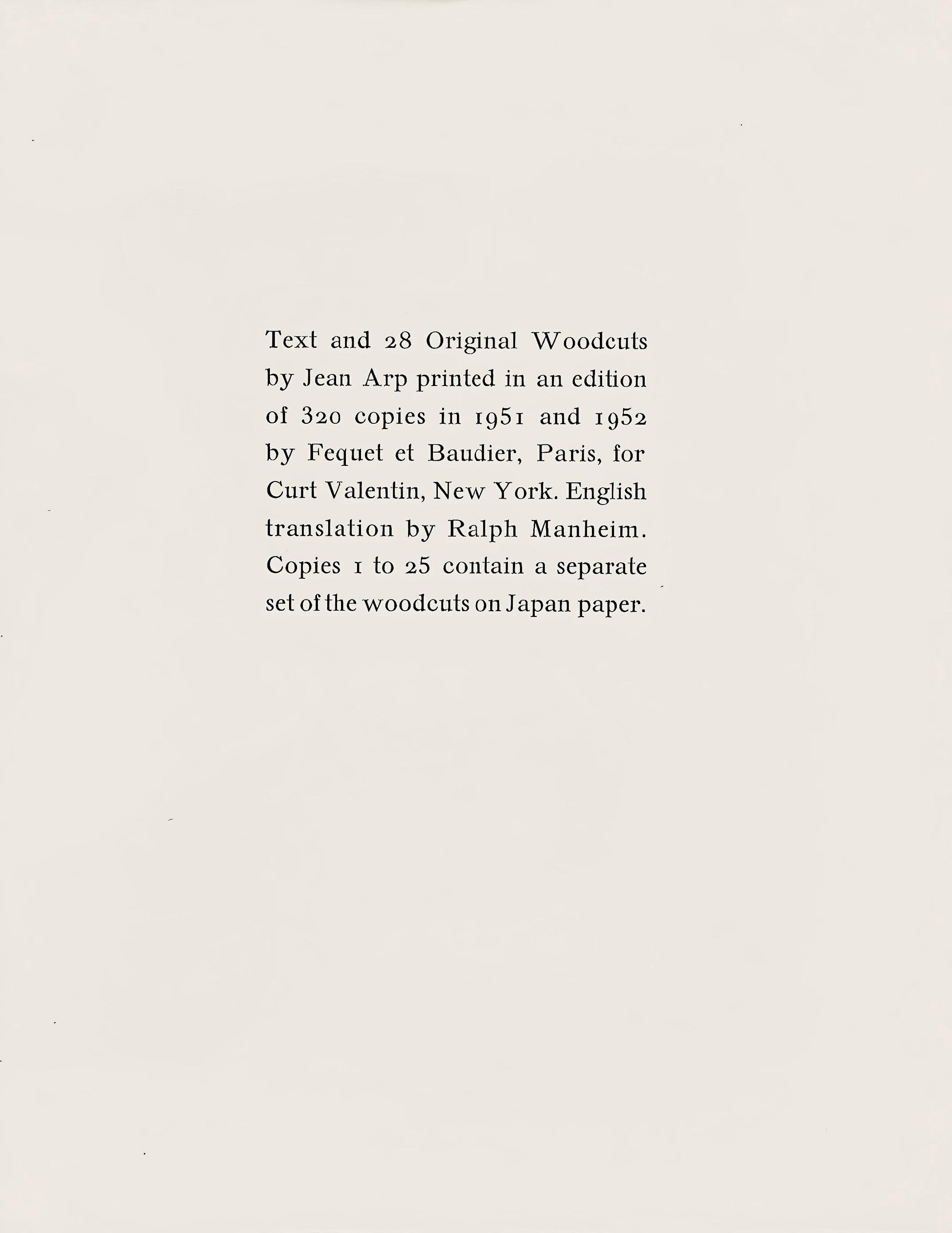 Woodcut on vlin dArches paper. Paper size: 11.25 x 8.875 inches. Excellent condition. Inscription: Unsigned and unnumbered, as issued. Notes: From the folio, Jean Arp, Dreams and Projects, 1951-1952, 1952. Published by Curt Valentin, New York; printed by Fequet et Baudier, Paris, 1952. Excerpted from the folio, Text and 28 original woodcuts by Jean Arp printed in an edition of 320 examples in 1951 and 1952 by Fequet et Baudier, Paris, for Curt Valentin, New York. English translation by Ralph Manheim. Examples 1 to 25 contain a separate set of the woodcuts on Japon paper.