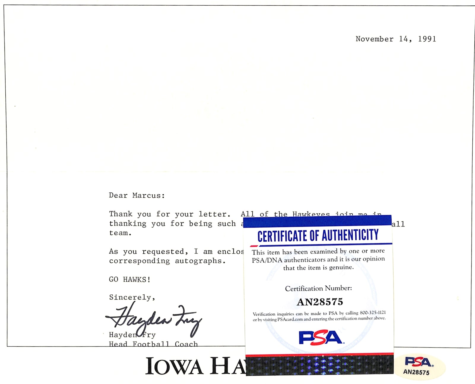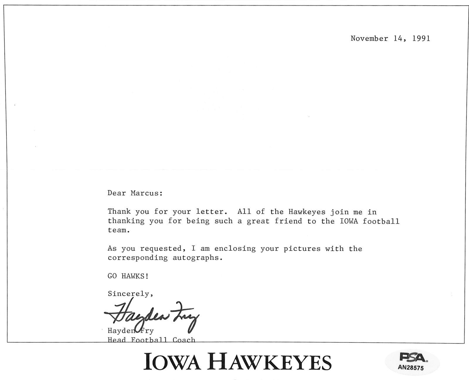 Hayden Fry Football Coach Signed Tls Letter University Of Iowa Psa/Dna 185276