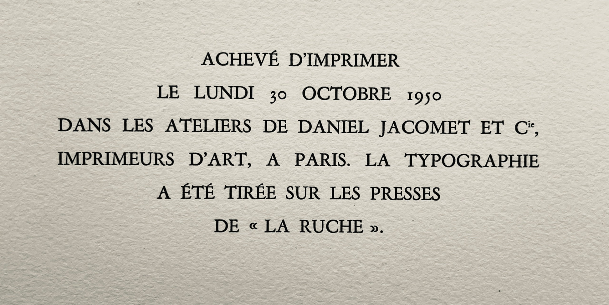 Published by Librairie Au Pont des Arts, Paris; rendered by Daniel Jacomet; and, printed by Ateliers Daniel Jacomet et Cie, Paris, Monday, October 30, 1950.
