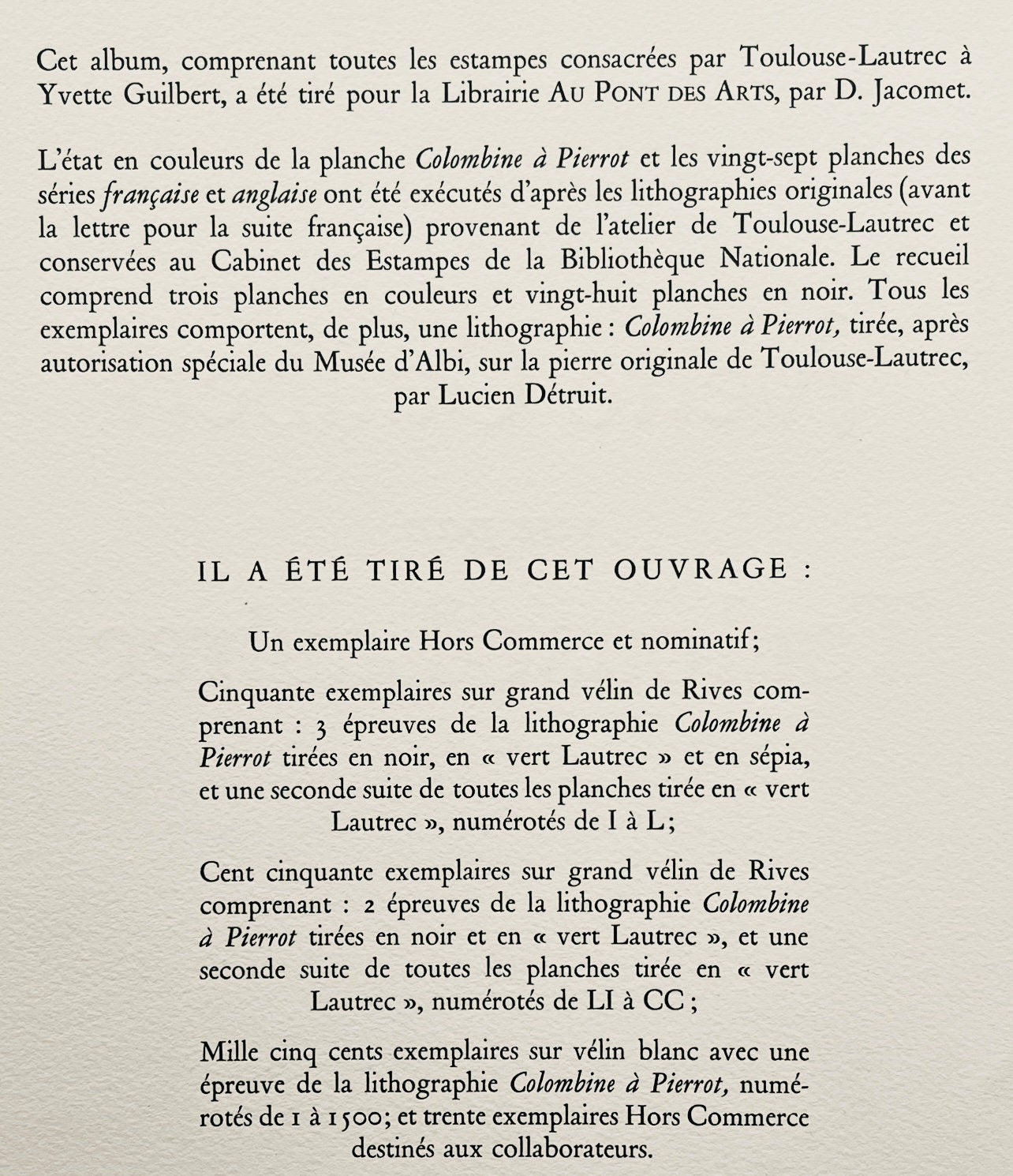 All copies also include a lithograph: Colombine Pierrot, taken, after special authorization from the Muse d'Albi, on the original stone of Toulouse-Lautrec, by Lucien Dtruit. It was taken from this album: A non-trade and nominative example; L examples on a large vlin of Rives including: III proofs of the lithography Colombine Pierrot printed in black, "vert Lautrec" and sepia, and a second series of all the plates drawn in "vert Lautrec," numbered from I to L; CL examples on large vlin of Rives including: II proofs of the Colombine lithography in Pierrot printed in black and "vert Lautrec," and a second series of all the plates drawn in "vert Lautrec," numbered from LI to CC; MD examples on white vlin with a proof of the Colombine lithography in Pierrot, numbered from I to MD; and XXX examples, Hors Commerce for employees.