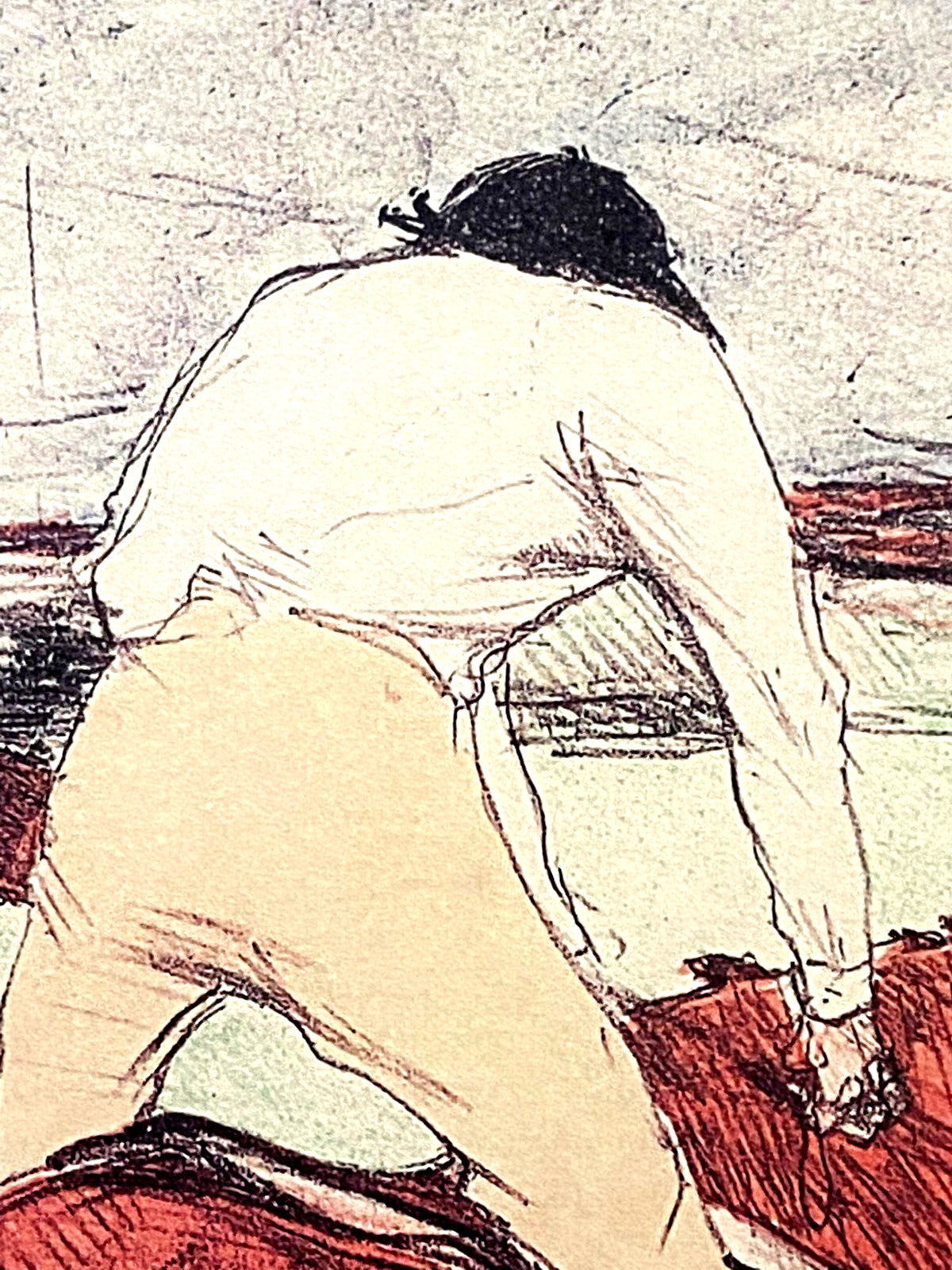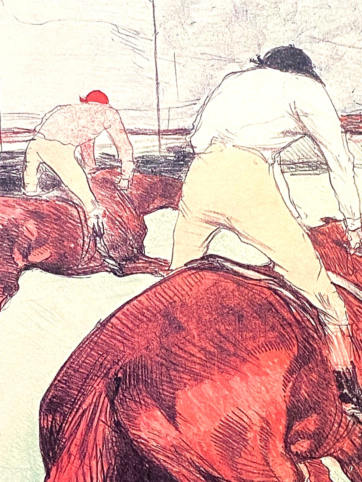 Lautrec was a passionate visitor to horse races. This powerful and dynamic print presents an unusual image of horses of horses as the jockeys are shown from behind. In this way, the joint performance of man and the animal are shown at best.