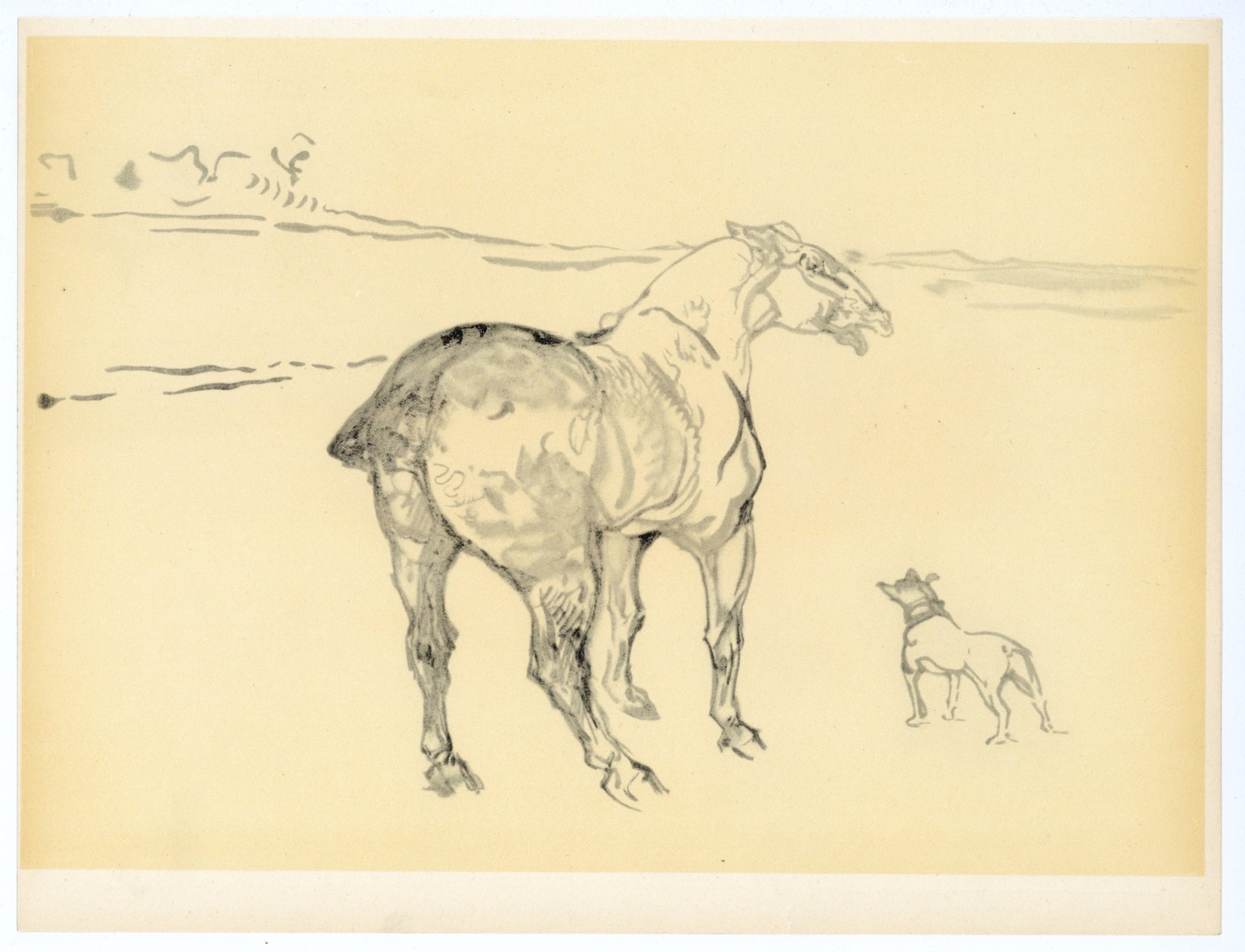 Lithograph on vlin paper. Unsigned and unnumbered. Paper Size: 12.125 x 9.25 inches. Excellent condition. Notes: From the album, The Circus by Toulouse-Lautrec, 1952. Published the Paris Book Center, New York, in conjunction with ditions Andr Sauret, Monte-Carlo; printed by Mourlot Frres, Paris, in an edition of MDLXX, October, 1952. Excerpted from the album, From early childhood Toulouse-Lautrec was attracted by the circus. It was, in fact, through a friend of his family, Ren Princeteau, himself a painter, that he acquired this taste while still very young. Princeteau was a painter of horses and their riders, both men and women, and he exerted quite an influence on Lautrec's early education. Despite the great difference in their ages, they got along splendidly and the circus became their favorite form of enter-tainment. Later, Lautrec paid frequent visits to the Molier and Fernando circuses as well as to the Nouveau Cirque. His strange silhouette with its long torso set on over-short legs could be seen standing close to the "rail" during training periods, or later, loafing about in the corridors. His retentive memory noted everything : the movements of the horses and their riders, the acrobats, the facial expressions of the clowns, an entire world of its own intensely alive and, for him, fascinating. He took few rough notes and only occasionally made a quick drawing of the grimaces of the famous clown, Footitt, whose sketches with the negro " Chocolat" as partner attracted the whole of Paris to the Nouveau Cirque. Lautrec had met Footitt, whom he admired very much, in a bar in the Rue Royale and, for a while, he used to go there to join him. But although Lautrec liked the spectacle of the circus, he also liked to go to bars and cafs, with the result that, at the beginning of the year 1899 he gave evidence of mental disorders. There were those who insisted even that he was mad; but this was not the case. He was seized with occasional fits of hallucination, following upon long moments of lucidity. His friend, Arsne Alexandre, said of him: " This strange, daring little man descended into Hell, but he came out of it with his own fur singed; for a time, alcohol, loathsome alcohol, ravaged the painter as it had his models". With the approval of his doctor, and to calm Lautrec's nerves, a plan was envisaged to send him on a voyage to Japan. In the end, however, he went to Doctor Semelaigne's nursing-home in Neuilly. This eighteenth-century house, called originally "Folie Saint-James", proved to be very hospitable. But Lautrec did not remain inactive. His solitude weighed on him, in addition to which he was determined to prove that his mind was not really affected. He asked for pencils and paper, and soon his room was transformed into a studio. Unfortunately, models were few, the house attendants being so very different from the creatures that peopled Montmartre. Should he return to his usual subjects? He had already portrayed too many bars and houses of ill-fame. It was here that he decided to depict the circus scenes that had always struck his fancy. So he set to work. It has been thought that at this period he worked from memory. This is undoubtedly true as regards the drawings in which Footitt, "Chocolat" and the woman-clown Cha-U-Kao are to be seen. But it is also possible, as M. Adhmar believes, that he executed others from nature. The explanation is a simple one : Lautrec's condition having rapidly improved, he was soon allowed to go out with an attendant. As it happened, the Molier circus, in the Rue Bnouville, was not far from Lautrec's nursing-home. He was surely accompanied. But he was able to sketch from life while the troupe was practising or, at least, return to the nursing-home and set down immediately what he had just seen. In many of these subjects it will, in fact, be noted that the benches are empty, as during a rehearsal, and those of the drawings that reproduce the riding exercices engaged in by Molier's pupils, Blanche Allarty and Anna Bradbury, show extraordinary precision. This fact was already noted by Maurice Joyant. In any case, Lautrec succeed in constituting little by little a complete series of thirty-nine drawings in black and colored crayons, all of which show great mastery and are in no way the work of a mad-man. All they show are certain exaggerations of proportion, but this is a question of artistic deformation and proves, as Miss Mongan has emphasized, "the integrity of his painter's faculties. Lautrec set down the things that struck him with a humour that was all his own : the gentle movement of a rider's skirt, while the big horse continues to gallop peacefully around the arena; trained dogs, especially poodles, being drilled by a clown armed with a whip; or acrobats, so skillful and so true to stock, risking their lives for the public. Most of these drawings as, for instance, "the rearing horse," "the jockey, and the animal-trainer", are masterpieces of composition and movement. They denote an aristocratic vision of the circus that is quite different from that expressed by Rouault, a little later (I). The colored pencil which, in an awkward hand, can produce such weak effects, is used here with supreme freedom of movement. Lautrec uses too, occasionally, a china-ink wash as, for example, in the "negro playing the banjo". However, once these drawings were finished, Lautrec, who had also completed several lithographs, began to be bored, and took a general dislike for his fellow-patients whom he termed "too dis-gusting". Friends who called to see him, expecting to find him haggard and barely able to speak, now found themselves in the presence of a little man with a keen eye and a generally relaxed expression. His condition having shown regular improvement, he was therefore released. He was to retain, in fact, a rather pleasant memory of his stay at Saint-James. Alas, however, his taste for alcohol soon returned, dominating his entire existence. Meanwhile, wha