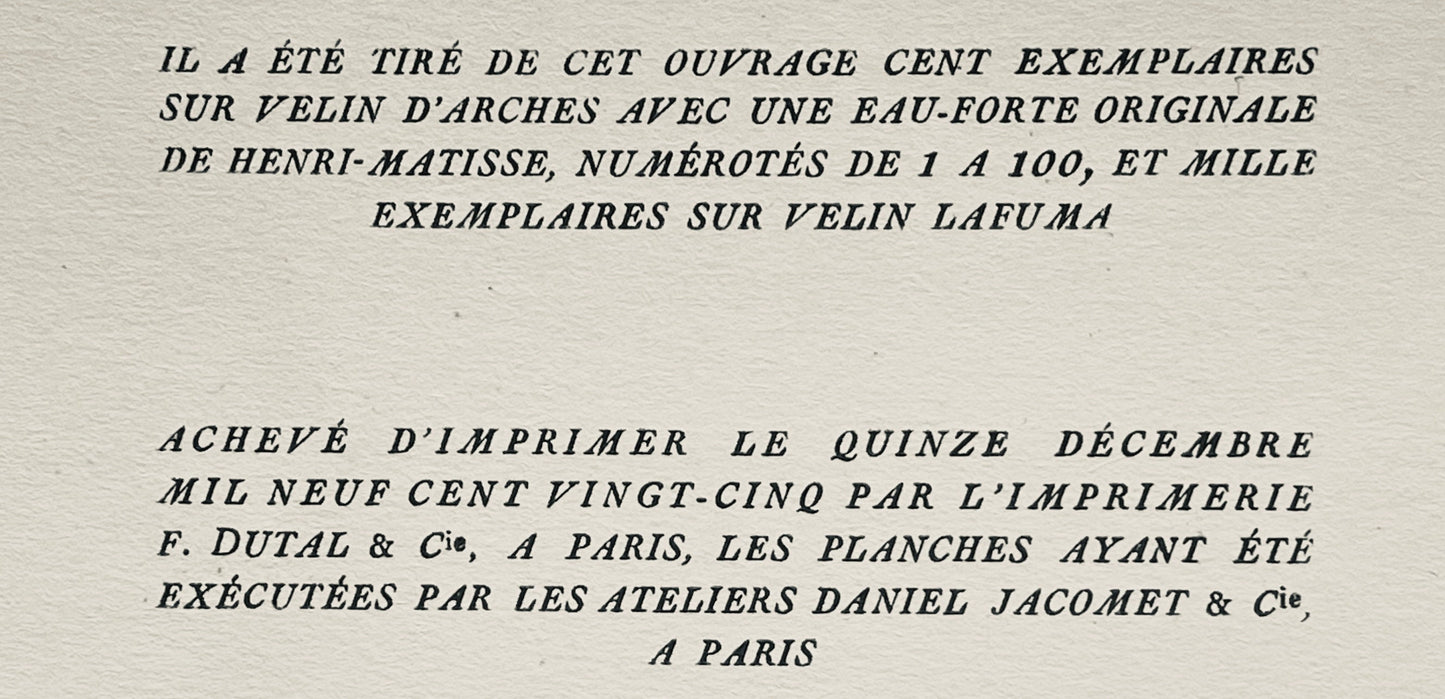 Lithograph on vlin Lafuma paper. Unsigned and unnumbered. Paper Size: 10 x 8 inches. Excellent condition. Notes: From the album, Dessins de Henri-Matisse, 1925. Published by ditions des Quatre Chemins, Paris; lithographic plates rendered by Daniel Jacomet & Cie, Paris; printed by F. Dutal & Cie, Paris, December 15, 1925. Excerpted from the album (translated from French), This album was printed in C issues on vlin d'Arches with an original issue by Henri-Matisse, numbered from I to C, and M issues on vlin Lafuma. Printing was completed on December fifteenth thousand nine hundred and twenty-five by F. Dutal & Cie, in Paris; the boards having been executed by the Daniel Jacomet & Cie workshops in Paris.