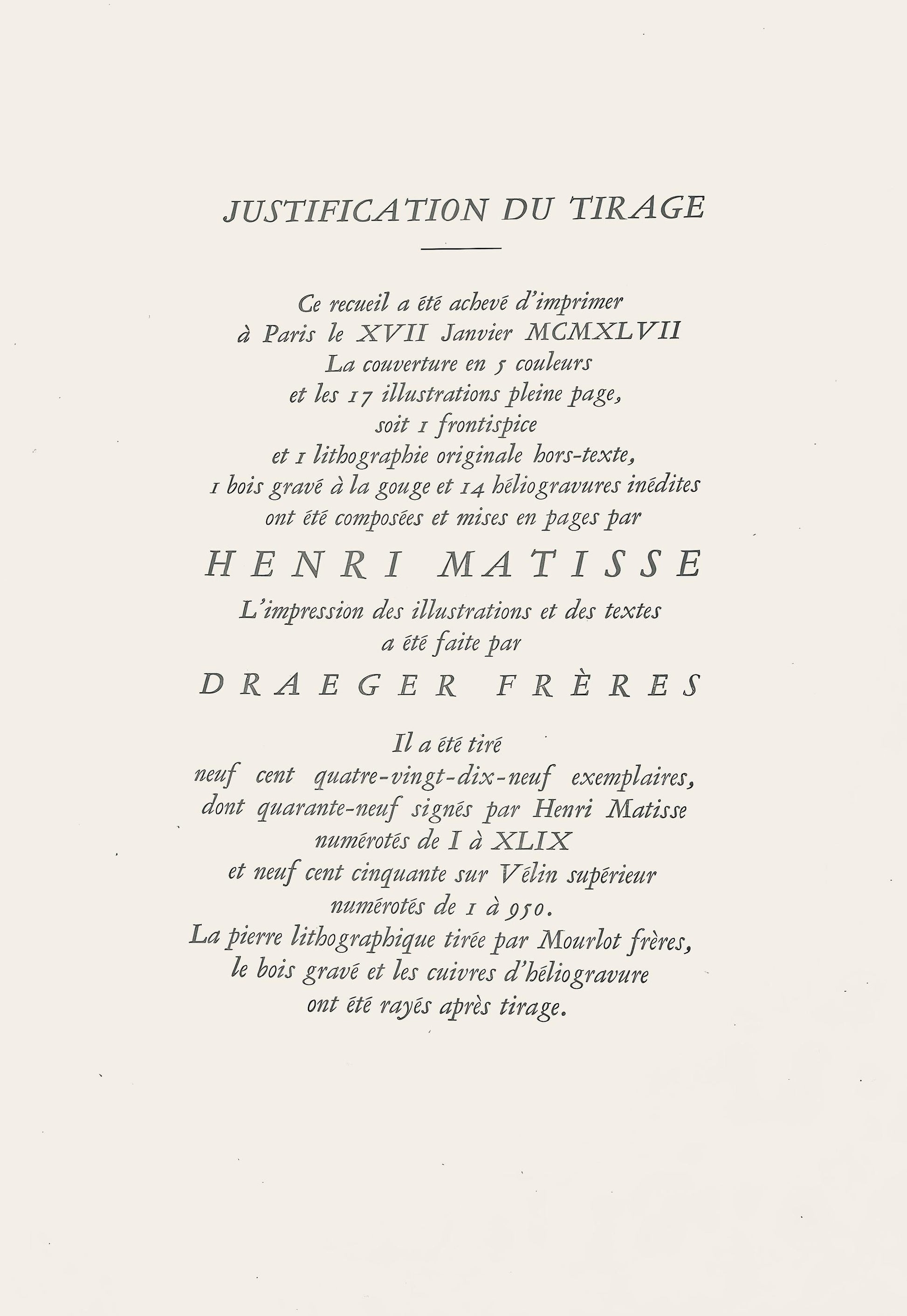 I frontispiece and one original non-text lithograph, I gouge engraved wood and fourteen unpublished rotogravures were composed and layouted by Henri Matisse.