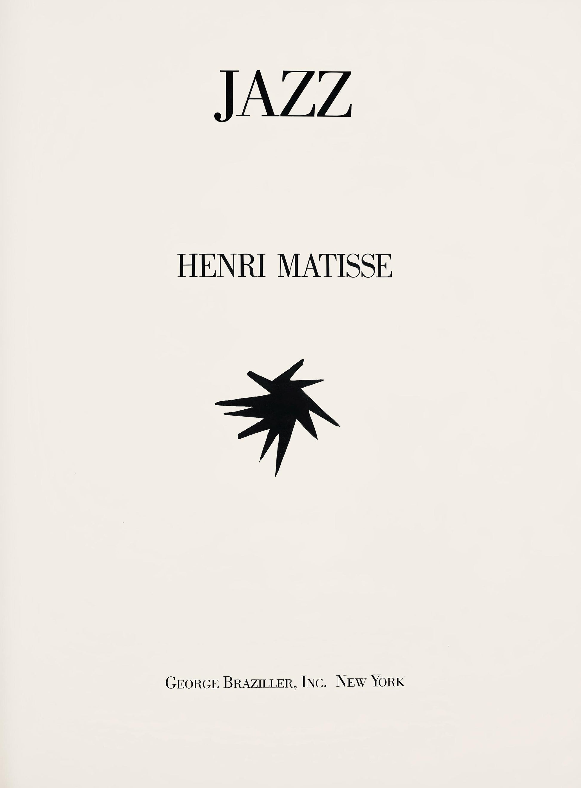 Hliogravure on vlin paper. Paper Size: 15 x 22.25 inches. Excellent condition, with centerfold, as issued. Inscription: Unsigned and unnumbered, as issued. Notes: From the folio, Henri Matisse, Jazz, Special Edition for the Museum of Modern Art, 1983. Published by George Braziller, Inc., New York; printed by Ernst Wartelsteiner, Munich, West Germany, 1983. Excerpted from the folio, Published in the United States of America by George Braziller, Inc. in 1983. Jazz by Henri Matisse 1983 by the Estate of Henri Matisse, V.A.G.A., New York/Spadem, Paris. Introduction 1983 by Riva Castleman. Text by Henri Matisse translated from the French by Sophie Hawkes. English translation 1983 by George Braziller, Inc. All rights reserved. For information address the publisher: George Braziller: Inc. One Park Avenue, New York, New York 10016. The publisher is grateful to the Bayerische Staatsbibliothek, Munich, for permission to use example no. 43 of Jazz for facsimile. Reproduced and printed by Ernst Wartelsteiner, and bound by R. Oldenbourg GmbH in Munich, West Germany. First Edition. Excerpted from the folio (translated from French), This work has been completed to print, by the care of Triade for Les ditions Verve, September 30, 1947. The boards were executed with a stencil according to the collages and on the cutouts of Henri Matisse, by Edmond Vairel who used the same linel gouaches as the artist. The cover and pages of the manuscript were engraved and printed by Draeger Frres. He shot on vlin dArches, CCL examples, numbered from I to CCL and XX non-commerce copies numbered from I to XX. All examples were signed by the artist. It was also released in C albums containing exclusively all the boards of the album. Example number XLIII. Facsimile of the colophon to the original edition of CCL examples, signed by the artist and published by Triade for ditions Verve on 30 September 1947.