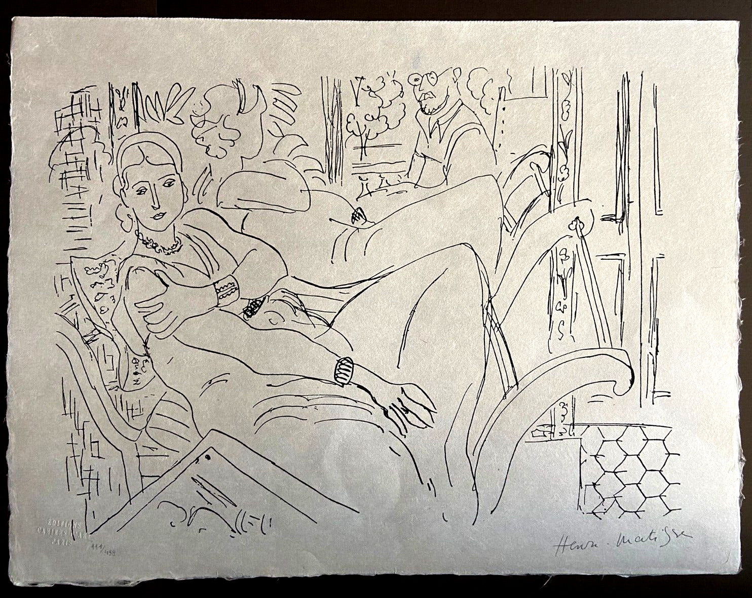 Henri Matisse Lithograph 1960 COA Signed Numbered By Hand Stamp @ Henri Matisse '' The painter and the model reflected '' The graphic work measures 45 x 60 cm with full sheet. First and only edition created by the famous Cahiers d'Art publishing house in 1960 on precious hand -done Japon Washi card. The edition is 499 ES as established by the contract between the publisher Christian Zervos and Maestro Matisse. Contract that will be delivered together with the art folder. Dry stamp on the "Editions Cahiers d'Artis" work. Signature Henri Matisse on the slab. "The drawings of the 1930s are considered by the master his greatest masterpieces. These designs represent women lying on wallpapers decorated with woven wovers of Arabesques and are miracles of pure lines that best enclose the sphere of female sensuality. In the reflections and mirrors Matisse seems to want to give the soul of his models in the most fine and virtuous traits. " Excellent condition of art folder of high collecting value, Lithograph on japon paper The graphic work measures 45 x 60 cm with full sheet. First and only edition created by the famous Cahiers d'Art publishing house in 1960 on precious hand -done Japon Washi card. The edition is 499 ES as established by the contract between the publisher Christian Zervos and Maestro Matisse. Contract that will be delivered together with the art folder. "The drawings of the 1930s are considered by the master his greatest masterpieces. These designs represent women lying on wallpapers decorated with woven wovers of Arabesques and are miracles of pure lines that best enclose the sphere of female sensuality. In the reflections and mirrors Matisse seems to want to give the soul of his models in the most fine and virtuous traits. " Excellent condition of art folder of high collecting value, Li