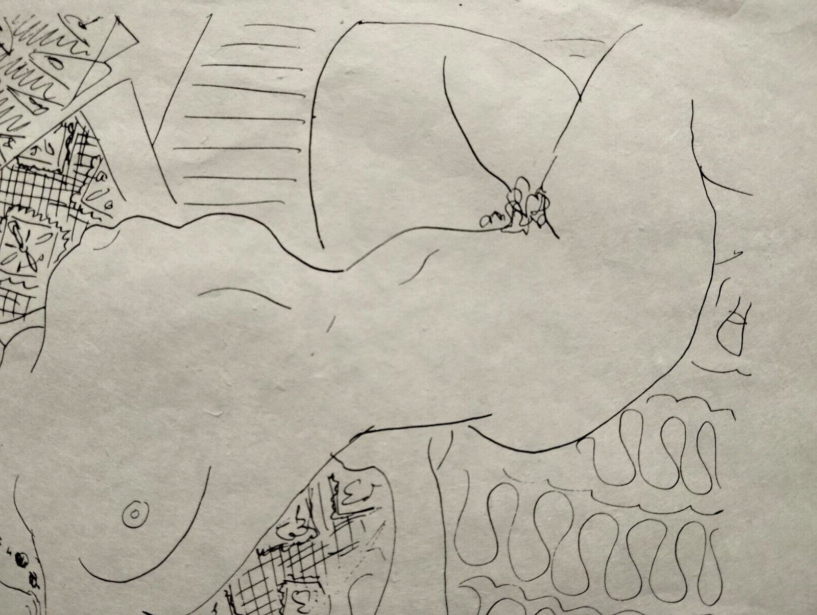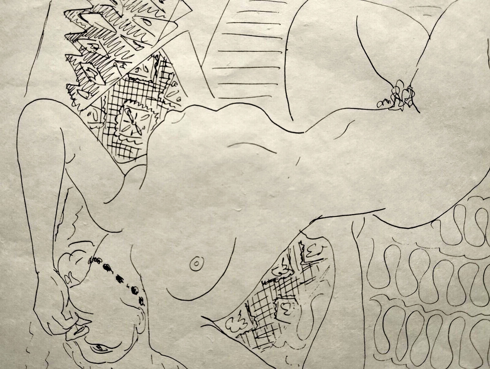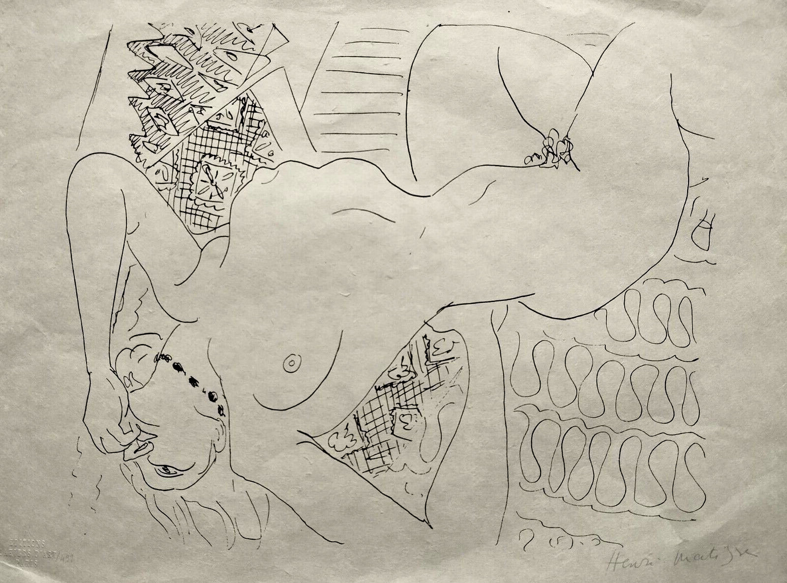 HENRI MATISSE '' Nude upside down '' The graphic work measures 45 x 60 cm full sheet. "The drawings from the 1930s are considered by the master to be his greatest masterpieces. These drawings represent women reclining on backgrounds decorated with fabrics adorned with arabesques and are miracles of pure lines that best enclose the sphere of female sensuality. In the reflections and mirrors Matisse seems to want to imprint the soul of his models in the finest and most v......