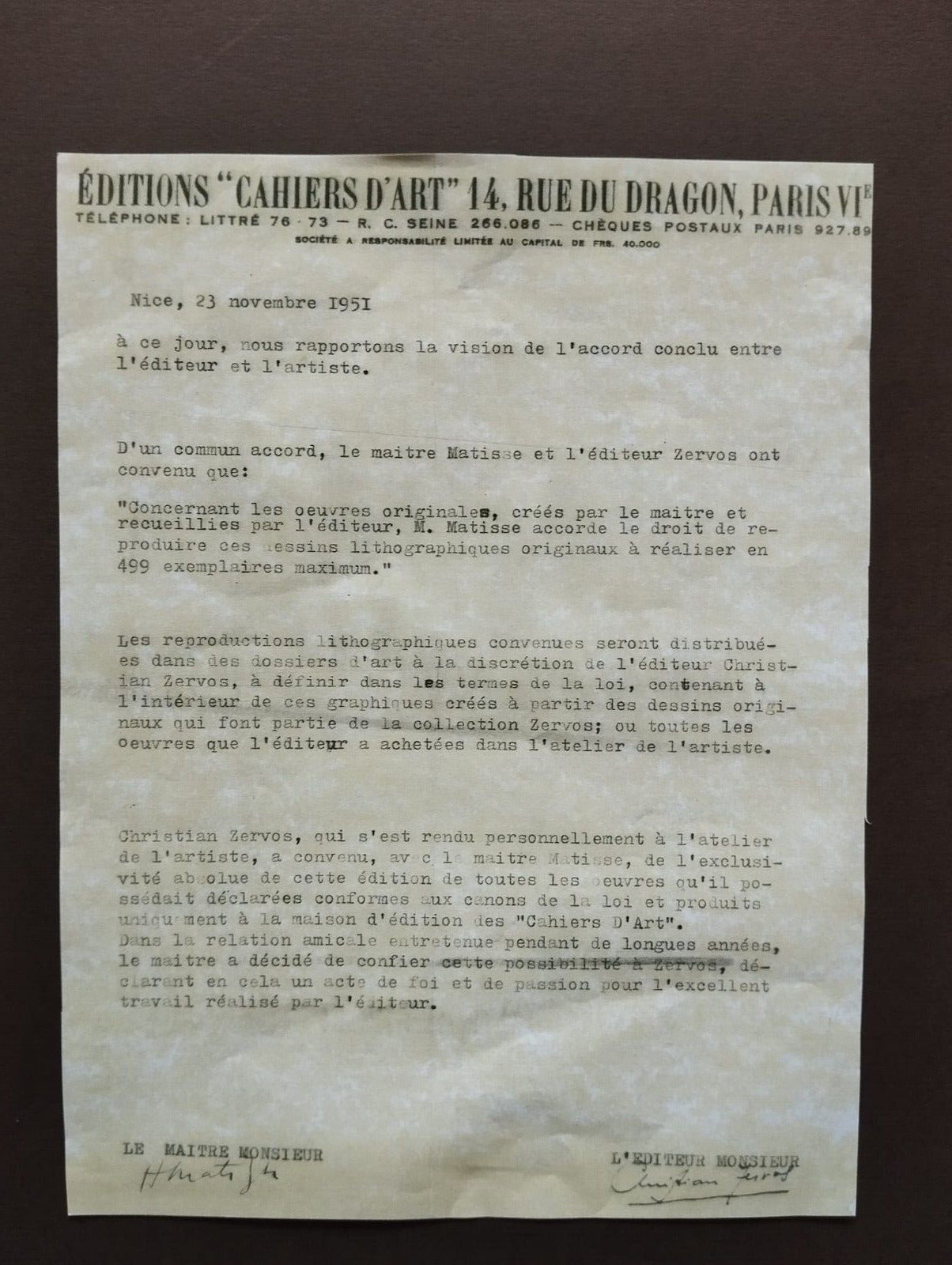Henri Matisse Lithograph Coa Contract Signed By Hand Numbered In Pencil Crayon
