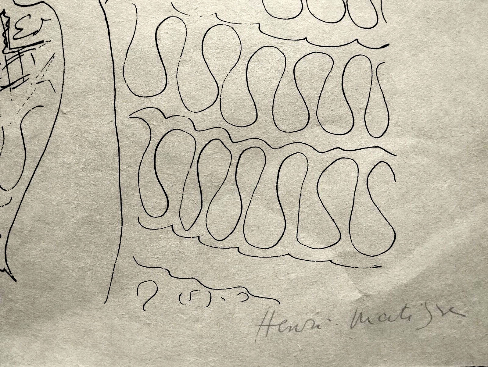 HENRI MATISSE '' Nude upside down '' The graphic work measures 45 x 60 cm full sheet. "The drawings from the 1930s are considered by the master to be his greatest masterpieces. These drawings represent women reclining on backgrounds decorated with fabrics adorned with arabesques and are miracles of pure lines that best enclose the sphere of female sensuality. In the reflections and mirrors Matisse seems to want to imprint the soul of his models in the finest and most virtuous lines." C.Zervos First and only edition made by the famous Cahiers d'Art publishing house in 1960 on precious handmade japon washi paper. Contract between the master and the publisher Zervos The circulation is 499 copies as established by the contract between the publisher Christian Zervos and the master Matisse. Contract that will be delivered together with the art folder. Embossing stamp on the work "Editions Cahiers d'Art Paris". Signed Henri Matisse on the plate. Like Edgar Degas, Egon Schiele, Piet Mondrian, Georges Braque, Raoul Dufy, Ren Magritte, Edvard Munch, Gustav Klimt, Paul Cezanne, Renoir, Rembrandt, Picasso, Amedeo Modigliani, Constantin Brancusi , Paul Gauguin, Georges Seurat, Henri De Toulouse-Lautrec , Vassily Kandinsky, Henri Matisse was one of the greatest artists of the 20th century. These drawings represent women reclining on backgrounds decorated with fabrics adorned with arabesques and are miracles of pure lines that best enclose the sphere of female sensuality. First and only edition made by the famous Cahiers d'Art publishing house in 1960 on precious handmade japon washi paper. Contract between the master and the publisher Zervos The circulation is 499 copies as established by the contract between the publisher Christian Zervos and the master Matisse. Contract that will be delivered together with the art folder. Like Edgar Degas, Egon Schiele, Piet Mondrian, Georges Braque, Raoul Dufy, Ren Magritte, Edvard Munch, Gustav Klimt, Paul Cezanne, Renoir, Rembrandt, Picasso, Amedeo Modigliani, Constantin Brancusi , Paul Gauguin, Georges Seurat, Henri De Toulouse-Lautr