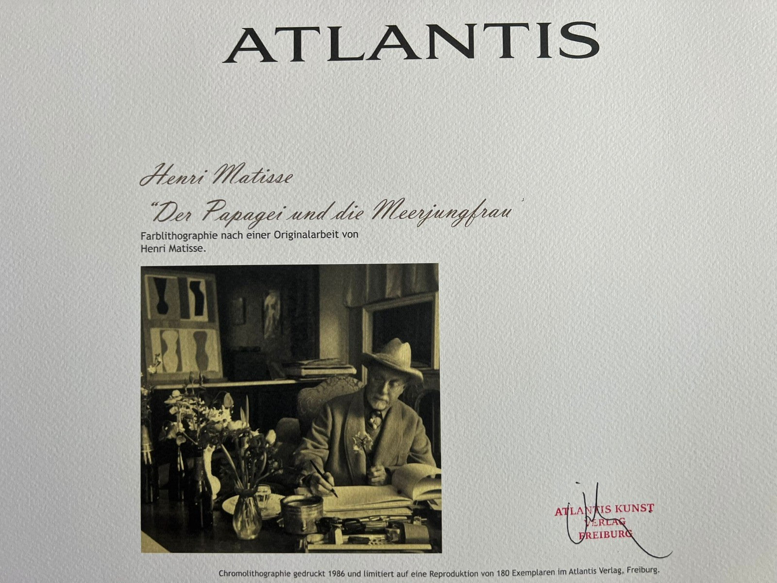 Henri Matisse Lithograph COA Signed Op Numbered In Pencil Henri Matisse '' The parrot and the siren '' Chromolithography printed in 1986 in 180 specimens by Atlantis Verlag, Freiburg 32 x 62 cm Signature Henri Matisse on the slab - COA signed in Penna Dry and authentic stamp of the publishing house Atlantis Kunst Verlag Freiburg For information you can contact us Henri Matisse ''The parrot and the siren'' Chromolithography printed in 1986 in 180 specimens by Atlantis Verlag, Freiburg 32 x 62 cm Signature Henri Matisse on the slab - COA signed in Penna Dry and authentic stamp of the publishing house Atlantis Kunst Verlag Freiburg For information you can contact us