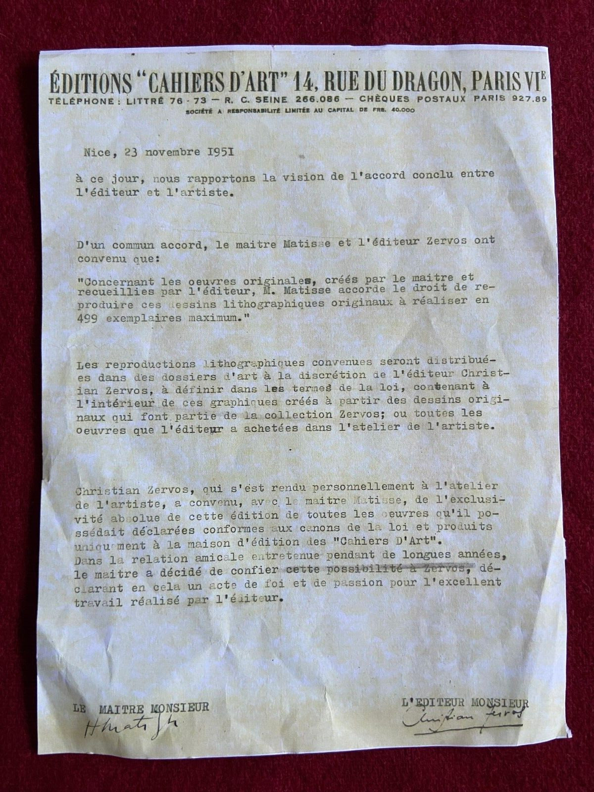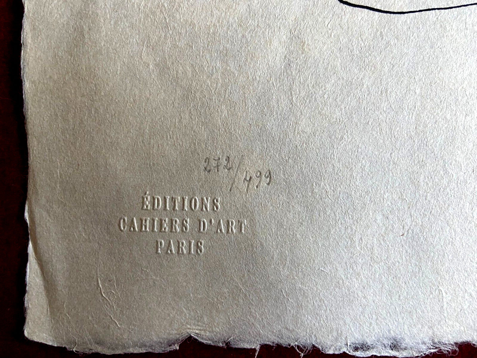 First and only edition created by the famous Cahiers d'Art publishing house in 1960 on precious hand -done Japon Washi card. The edition is 499 ES as established by the contract between the publisher Christian Zervos and Maestro Matisse. Contract that will be delivered together with the art folder. Dry stamp on the "Editions Cahiers d'Artis" work. Signature Henri Matisse on the slab.