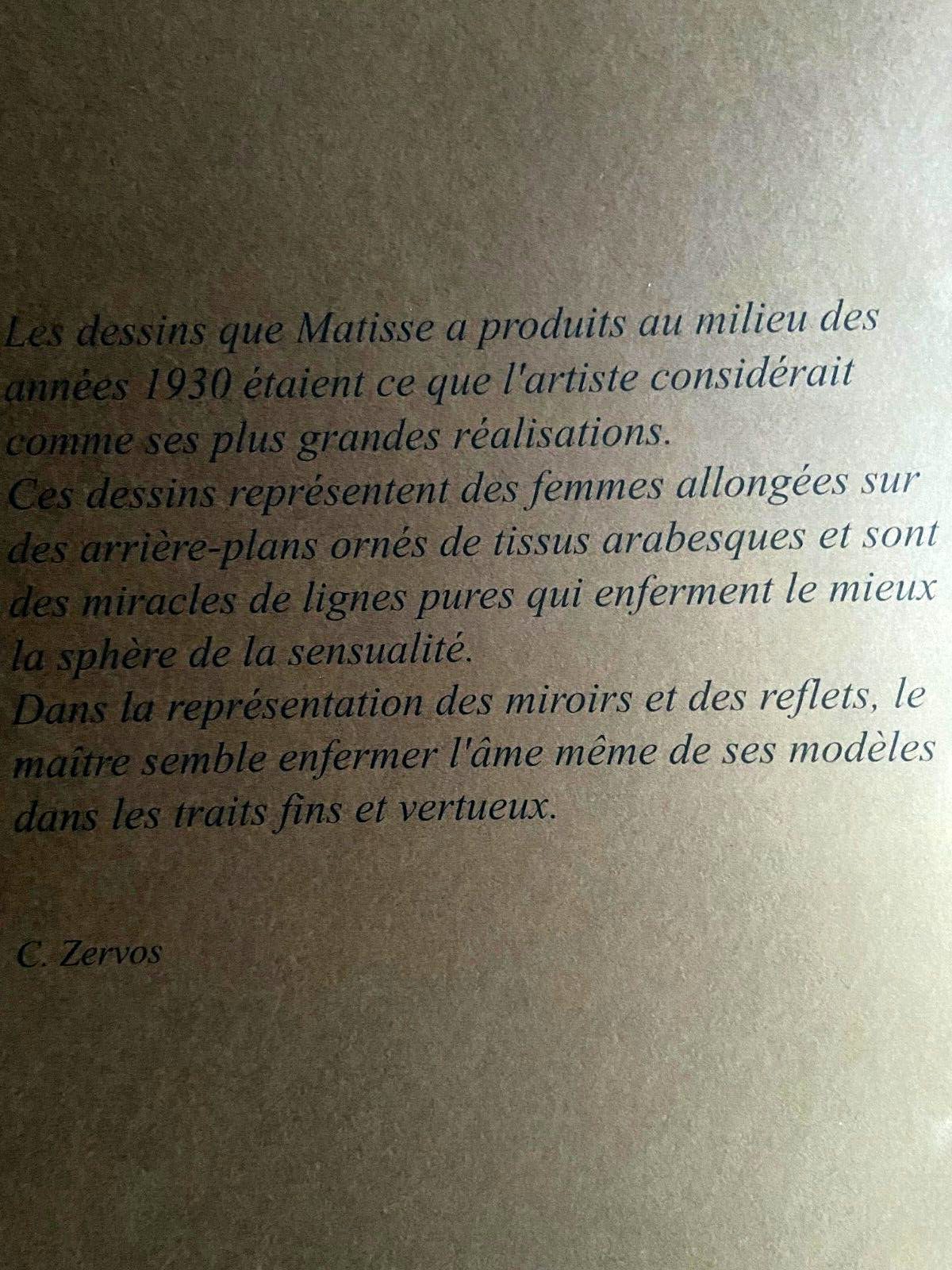 "The drawings of the 1930s are considered by the master his greatest masterpieces. These designs represent women lying on wallpapers decorated with woven wovers of Arabesques and are miracles of pure lines that best enclose the sphere of female sensuality. In the reflections and mirrors Matisse seems to want to give the soul of his models in the most fine and virtuous traits. " C. Zervos