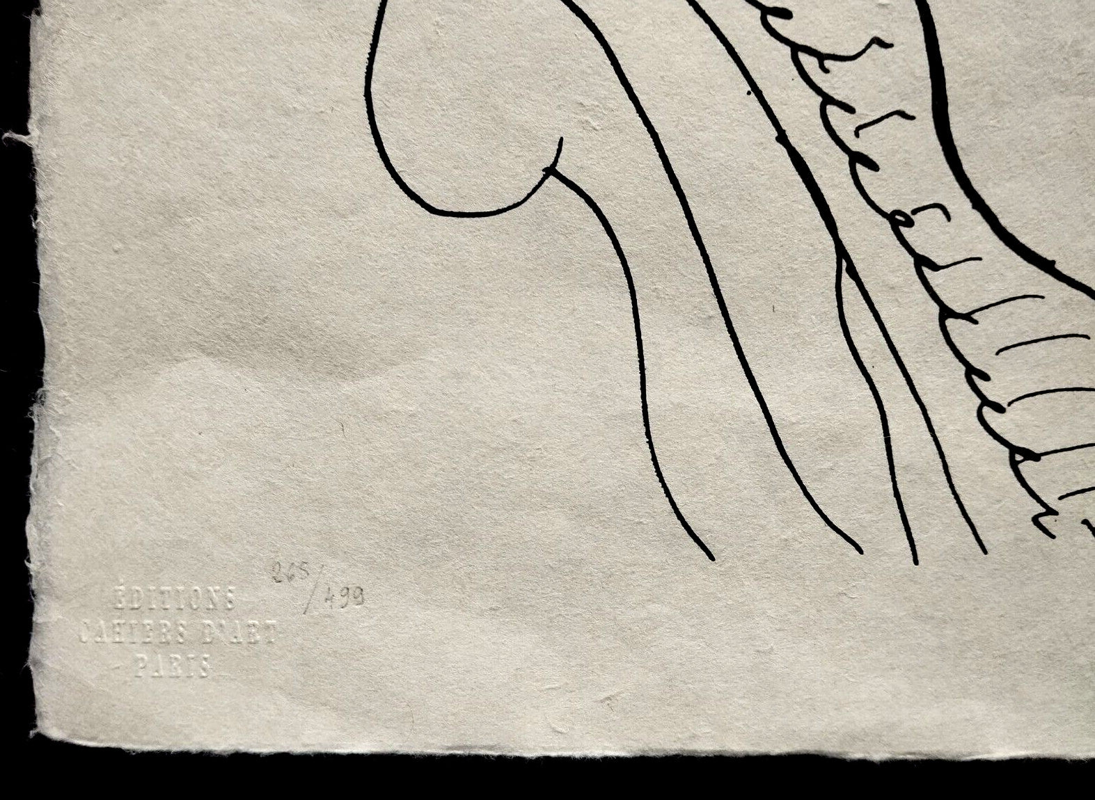 First and only edition created by the famous Cahiers d'Art publishing house in 1960 on precious hand -done Japon Washi card. Contract between the master and the publisher Zervos The edition is 499 ES as established by the contract between the publisher Christian Zervos and Maestro Matisse. Contract that will be delivered together with the art folder. Dry stamp on the "Editions Cahiers d'Artis" work. Signature Henri Matisse on the slab.