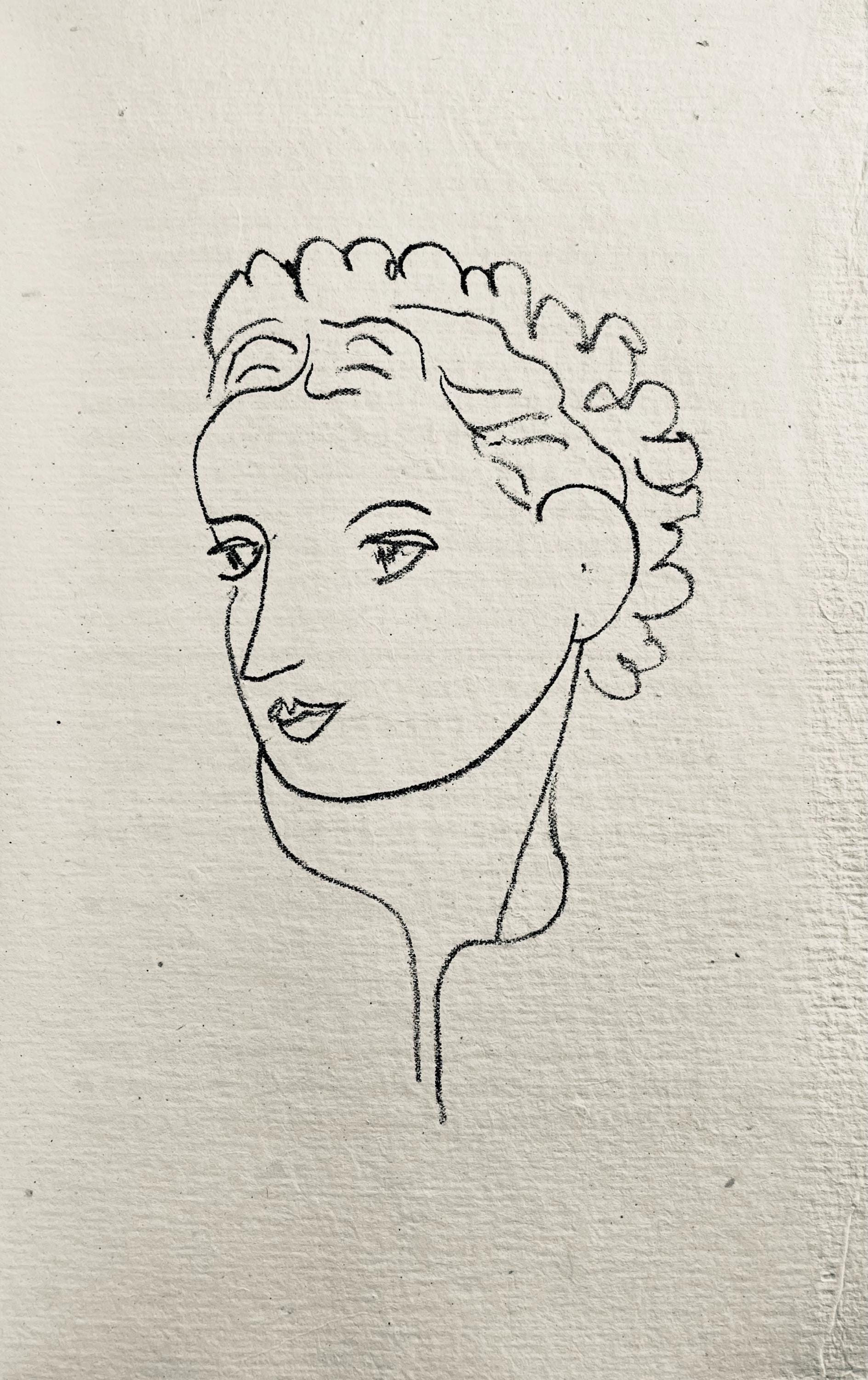 Lithograph on vlin a la forme des papeteries d'Arches paper. Unsigned and unnumbered. Paper Size: 10 x 6.375 inches. Excellent condition. Notes: From the volume, Repli, Gravures de Henri Matisse, 1947. Published by ditions du Blier, Paris; printed by Mourlot Frres, Paris. Excerpted from the volume (translated from French), Justification of the draw XXXV examples on vlin a la forme des papeteries de Montval, accompanied by a series of lithographs drawn on chine, numbered from I to XXV and I to X; CCCXV examples on vlin a la forme des papeteries d'Arches, numbered from XXVI to CCL and from XI to C. In addition, XX examples were drawn on Arches, intended for the various collaborators, all nominative. The lithographs were printed on papier Ile-de-France et Lana pur chif-fon. The linos and stones were scratched after drawing. All colophons are signed by the author and illustrator.