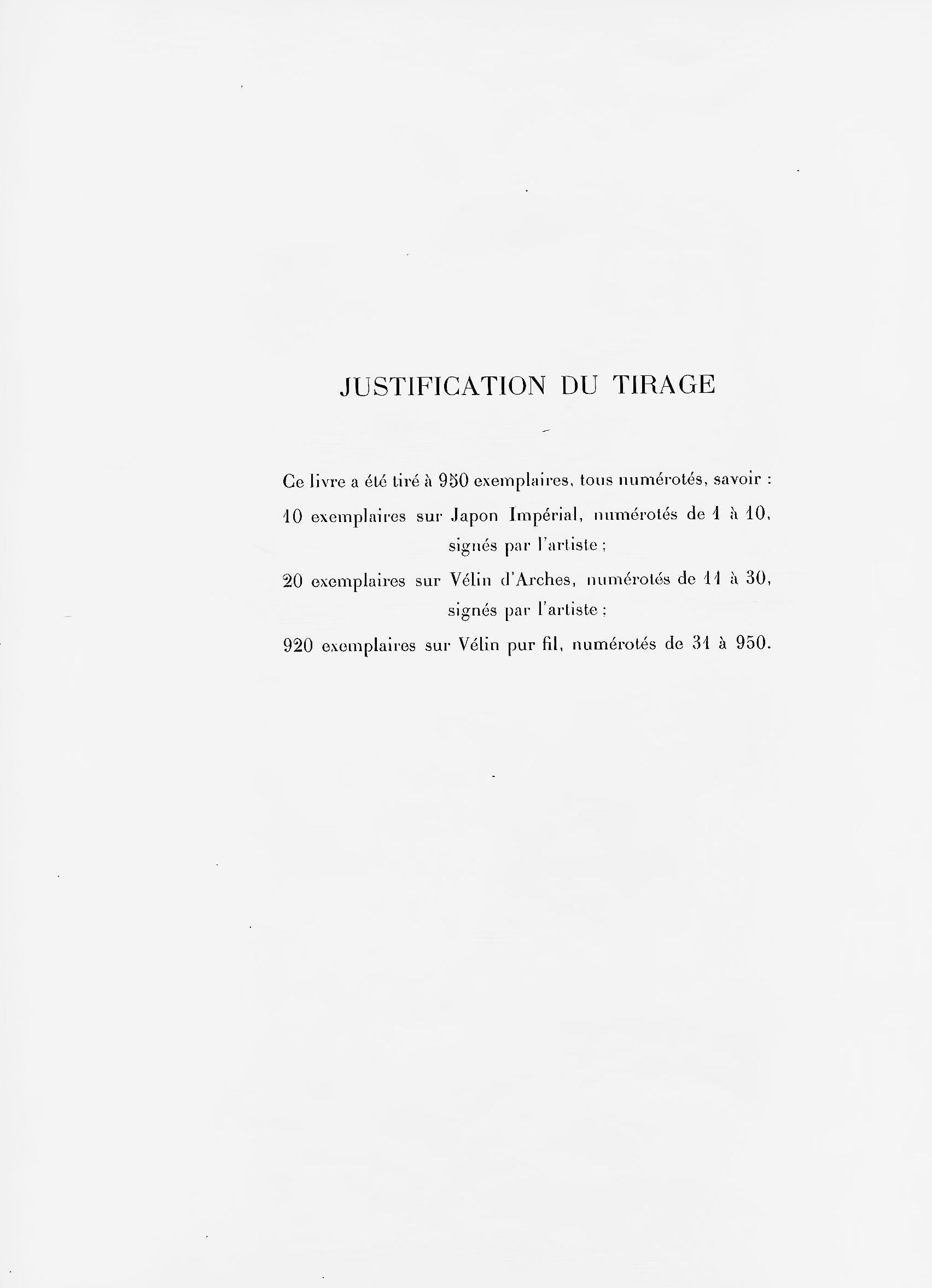 Justification of the drawThis folio has been printed in CML examples, all numbered, namely: X examples on Imperial Japan, numbered from I to X. Signed by the artist: XX examples on Vlin d'Arches, numbered from II to XXX, signed by the artist: CMXX examples on Vlin pur fil, numbered from XXXI to CML.