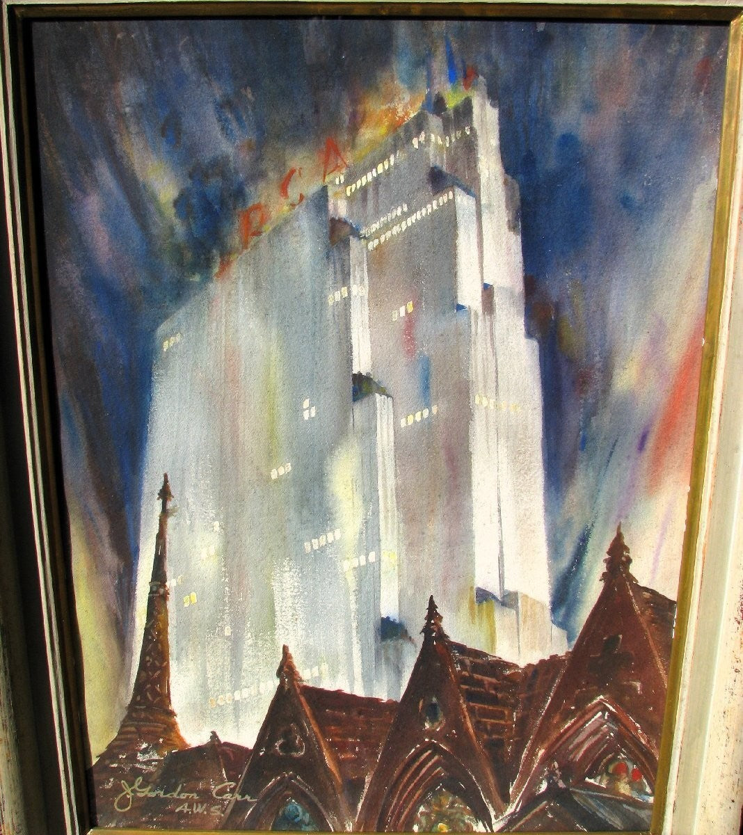 J. Gordon Carr A.W.S. Watercolor Painting "Rca Building" Nyc Signed Framed
